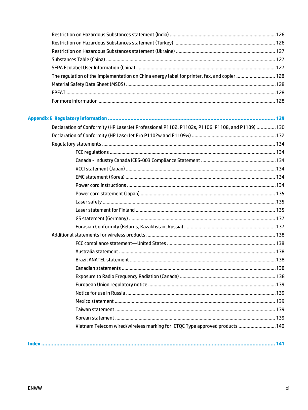 Restriction on Hazardous Substances statement (India) ................................................................................. 126 Restriction on Hazardous Substances statement (Turkey) ............................................................................. 126 Restriction on Hazardous Substances statement (Ukraine) ............................................................................ 127 Substances Table (China) .................................................................................................................................. 127 SEPA Ecolabel User Information (China) ........................................................................................................... 127 The regulation of the implementation on China energy label for printer, fax, and copier ............................. 128 Material Safety Data Sheet (MSDS) ................................................................................................................... 128 EPEAT ................................................................................................................................................................. 128 For more information ........................................................................................................................................ 128 Appendix E Regulatory information ............................................................................................................... 129 Declaration of Conformity (HP LaserJet Professional P1102, P1102s, P1106, P1108, and P1109) .............. 130 Declaration of Conformity (HP LaserJet Pro P1102w and P1109w) ................................................................ 132 Regulatory statements ..................................................................................................................................... 134 FCC regulations ............................................................................................................................... 134 Canada - Industry Canada ICES-003 Compliance Statement ......................................................... 134 VCCI statement (Japan) ................................................................................................................... 134 EMC statement (Korea) ................................................................................................................... 134 Power cord instructions .................................................................................................................. 134 Power cord statement (Japan) ....................................................................................................... 135 Laser safety ..................................................................................................................................... 135 Laser statement for Finland ........................................................................................................... 135 GS statement (Germany) ................................................................................................................ 137 Eurasian Conformity (Belarus, Kazakhstan, Russia) ...................................................................... 137 Additional statements for wireless products ................................................................................................... 138 FCC compliance statement—United States ................................................................................... 138 Australia statement ........................................................................................................................ 138 Brazil ANATEL statement ................................................................................................................ 138 Canadian statements ...................................................................................................................... 138 Exposure to Radio Frequency Radiation (Canada) ......................................................................... 138 European Union regulatory notice .................................................................................................. 139 Notice for use in Russia ................................................................................................................... 139 Mexico statement ........................................................................................................................... 139 Taiwan statement ........................................................................................................................... 139 Korean statement ........................................................................................................................... 139 Vietnam Telecom wired/wireless marking for ICTQC Type approved products ............................ 140 Index ........................................................................................................................................................... 141