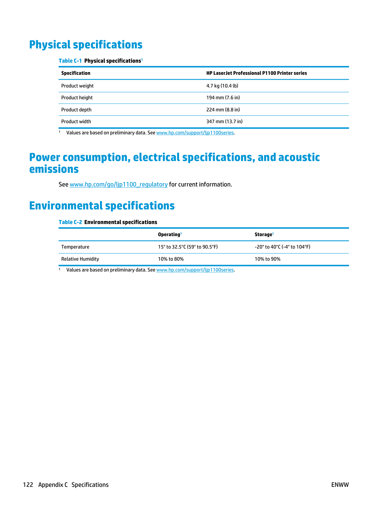 121Physical specifications Table C-1 Physical specifications1 Specification HP LaserJet Professional P1100 Printer series Product weight 4.7 kg (10.4 lb) Product height 194 mm (7.6 in) Product depth 224 mm (8.8 in) Product width 347 mm (13.7 in) 1 Values are based on preliminary data. See www.hp.com/support/ljp1100series. Power consumption, electrical specifications, and acoustic emissions See www.hp.com/go/ljp1100_regulatory for current information. Environmental specifications Table C-2 Environmental specifications