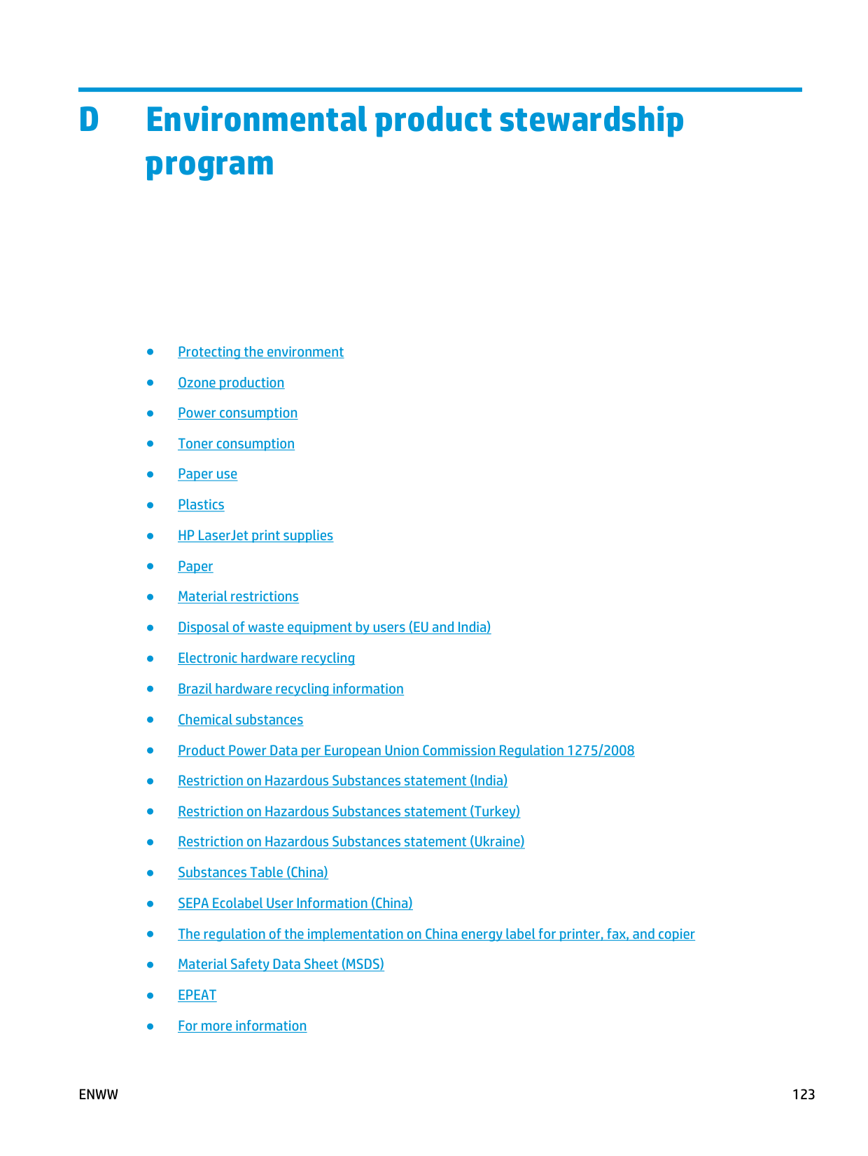 Environmental product stewardship program ● Protecting the environment ● Ozone production ● Power consumption ● Toner consumption ● Paper use ● Plastics ● HP LaserJet print supplies ● Paper ● Material restrictions ● Disposal of waste equipment by users (EU and India) ● Electronic hardware recycling ● Brazil hardware recycling information ● Chemical substances ● Product Power Data per European Union Commission Regulation 1275/2008 ● Restriction on Hazardous Substances statement (India) ● Restriction on Hazardous Substances statement (Turkey) ● Restriction on Hazardous Substances statement (Ukraine) ● Substances Table (China) ● SEPA Ecolabel User Information (China) ● The regulation of the implementation on China energy label for printer, fax, and copier ● Material Safety Data Sheet (MSDS) ●Epeat