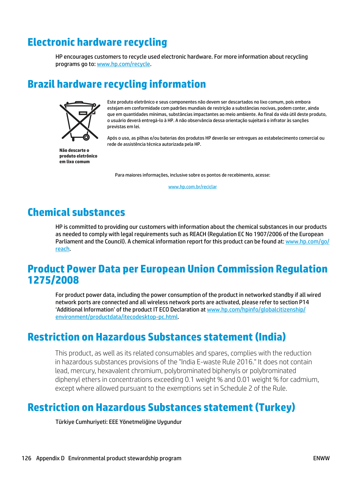 Paper use 125Electronic hardware recycling HP encourages customers to recycle used electronic hardware. For more information about recycling programs go to: www.hp.com/recycle. Brazil hardware recycling information Este produto eletrônico e seus componentes não devem ser descartados no lixo comum, pois embora estejam em conformidade com padrões mundiais de restrição a substâncias nocivas, podem conter, ainda que em quantidades mínimas, substâncias impactantes ao meio ambiente. Ao final da vida útil deste produto, o usuário deverá entregá-lo à HP. A não observância dessa orientação sujeitará o infrator às sanções previstas em lei. Após o uso, as pilhas e/ou baterias dos produtos HP deverão ser entregues ao estabelecimento comercial ou rede de assistência técnica autorizada pela HP. Para maiores informações, inclusive sobre os pontos de recebimento, acesse: www.hp.com.br/reciclar Chemical substances HP is committed to providing our customers with information about the chemical substances in our products as needed to comply with legal requirements such as REACH (Regulation EC No 1907/2006 of the European Parliament and the Council). A chemical information report for this product can be found at: www.hp.com/go/ reach. Product Power Data per European Union Commission Regulation 1275/2008 For product power data, including the power consumption of the product in networked standby if all wired network ports are connected and all wireless network ports are activated, please refer to section P14 ‘Additional Information’ of the product IT ECO Declaration at www.hp.com/hpinfo/globalcitizenship/ environment/productdata/itecodesktop-pc.html. Restriction on Hazardous Substances statement (India) Restriction on Hazardous Substances statement (Turkey) Türkiye Cumhuriyeti: EEE Yönetmeliğine Uygundur 126 Appendix D Environmental product stewardship program