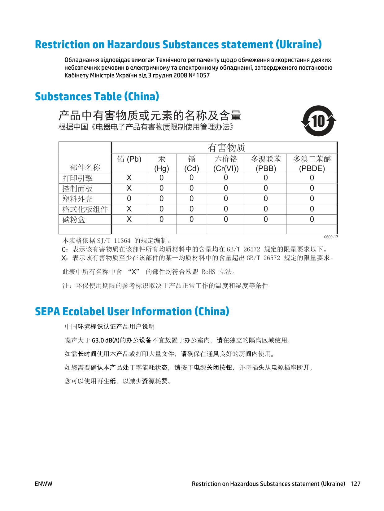 Restriction on Hazardous Substances statement (Ukraine) Обладнання відповідає вимогам Технічного регламенту щодо обмеження використання деяких небезпечних речовин в електричному та електронному обладнанні, затвердженого постановою Кабінету Міністрів України від 3 грудня 2008 № 1057 Substances Table (China) SEPA Ecolabel User Information (China) 中国环境标识认证产品用户说明 噪声大于63.0 dB(A)的办公设备不宜放置于办公室内,请在独立的隔离区域使用。 如需长时间使用本产品或打印大量文件,请确保在通风良好的房间内使用。 如您需要确认本产品处于零能耗状态,请按下电源关闭按钮,并将插头从电源插座断开。 您可以使用再生纸,以减少资源耗费。