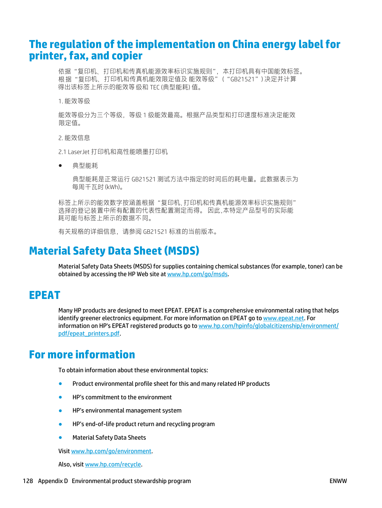 Many HP products are designed to meet EPEAT. EPEAT is a comprehensive environmental rating that helps identify greener electronics equipment. For more information on EPEAT go to www.epeat.net. For information on HP's EPEAT registered products go to www.hp.com/hpinfo/globalcitizenship/environment/ pdf/epeat_printers.pdf. For more information To obtain information about these environmental topics: ● Product environmental profile sheet for this and many related HP products ● HP’s commitment to the environment ● HP’s environmental management system ● HP’s end-of-life product return and recycling program ● Material Safety Data Sheets Visit www.hp.com/go/environment. Also, visit www.hp.com/recycle. 128 Appendix D Environmental product stewardship programEnww