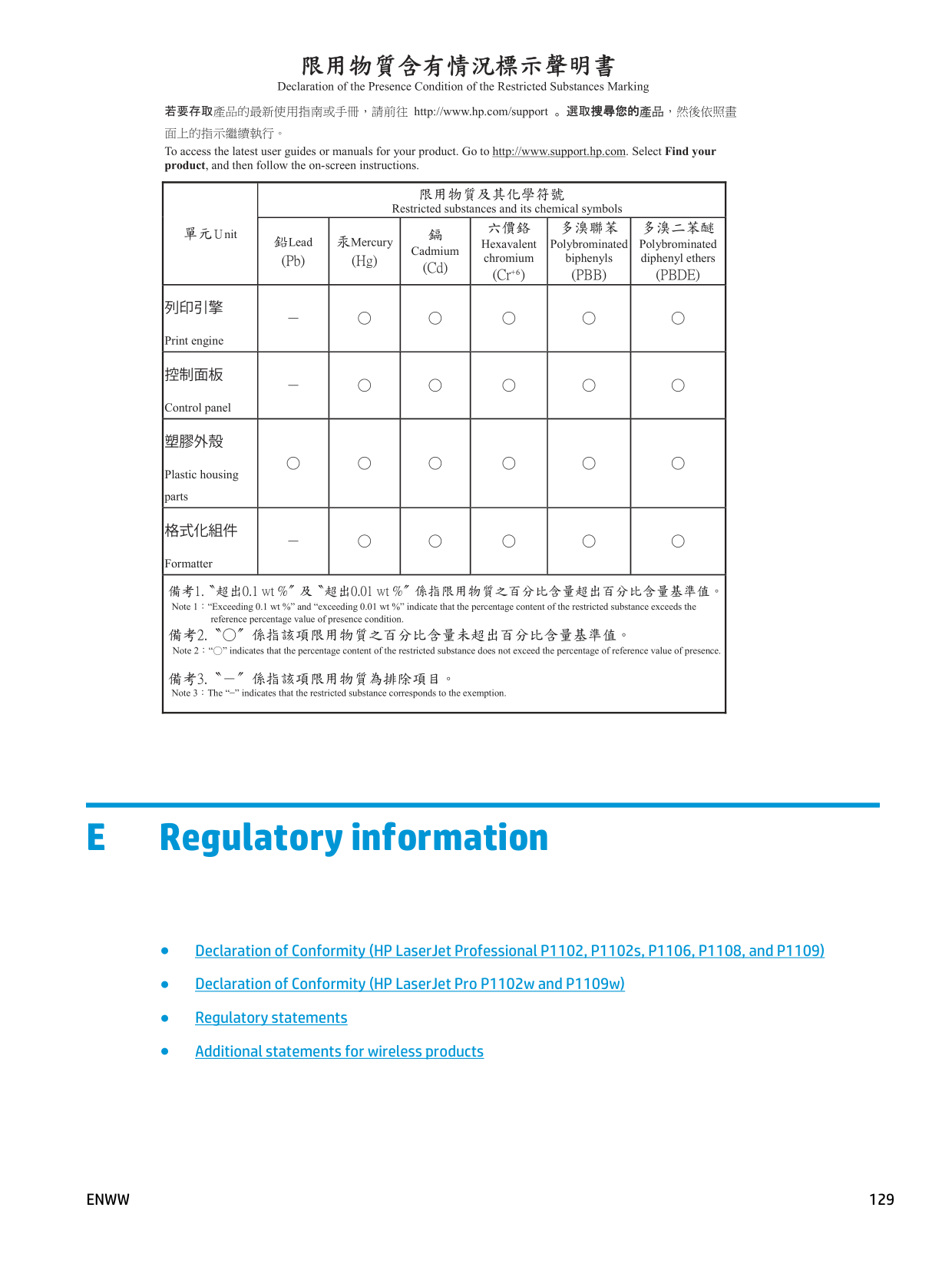Regulatory information ● Declaration of Conformity (HP LaserJet Professional P1102, P1102s, P1106, P1108, and P1109) ● Declaration of Conformity (HP LaserJet Pro P1102w and P1109w) ● Regulatory statements ● Additional statements for wireless productsEnww