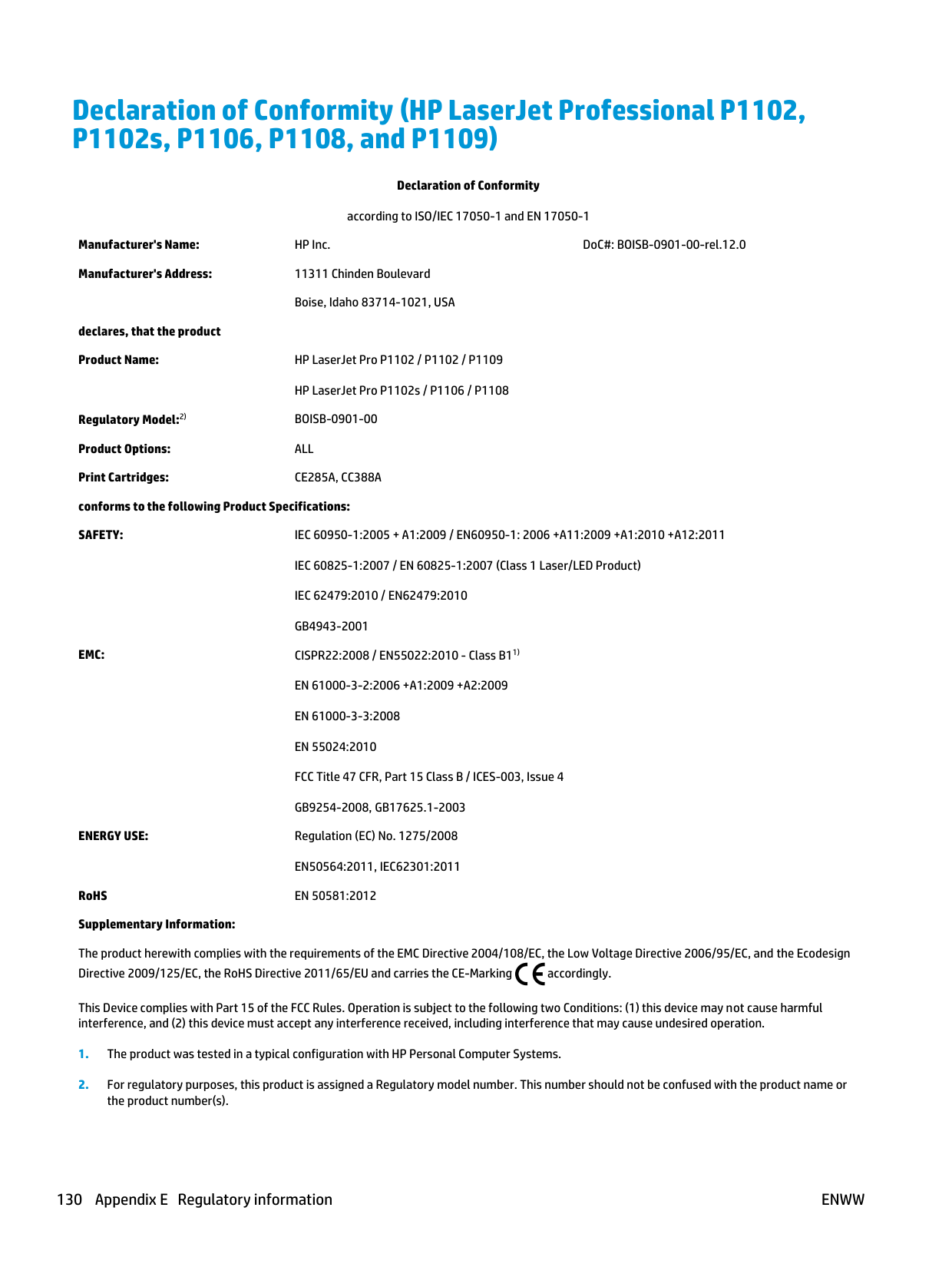 129Declaration of Conformity (HP LaserJet Professional P1102, P1102s, P1106, P1108, and P1109) Declaration of Conformity according to ISO/IEC 17050-1 and EN 17050-1 Manufacturer's Name: HP Inc. DoC#: BOISB-0901-00-rel.12.0 Manufacturer's Address: 11311 Chinden Boulevard