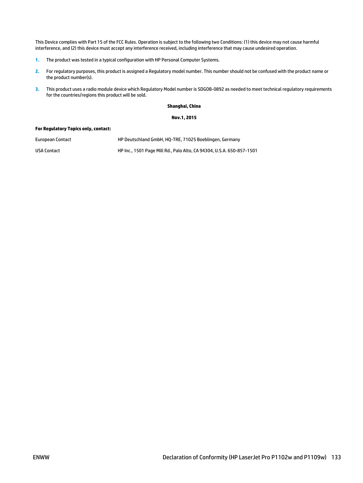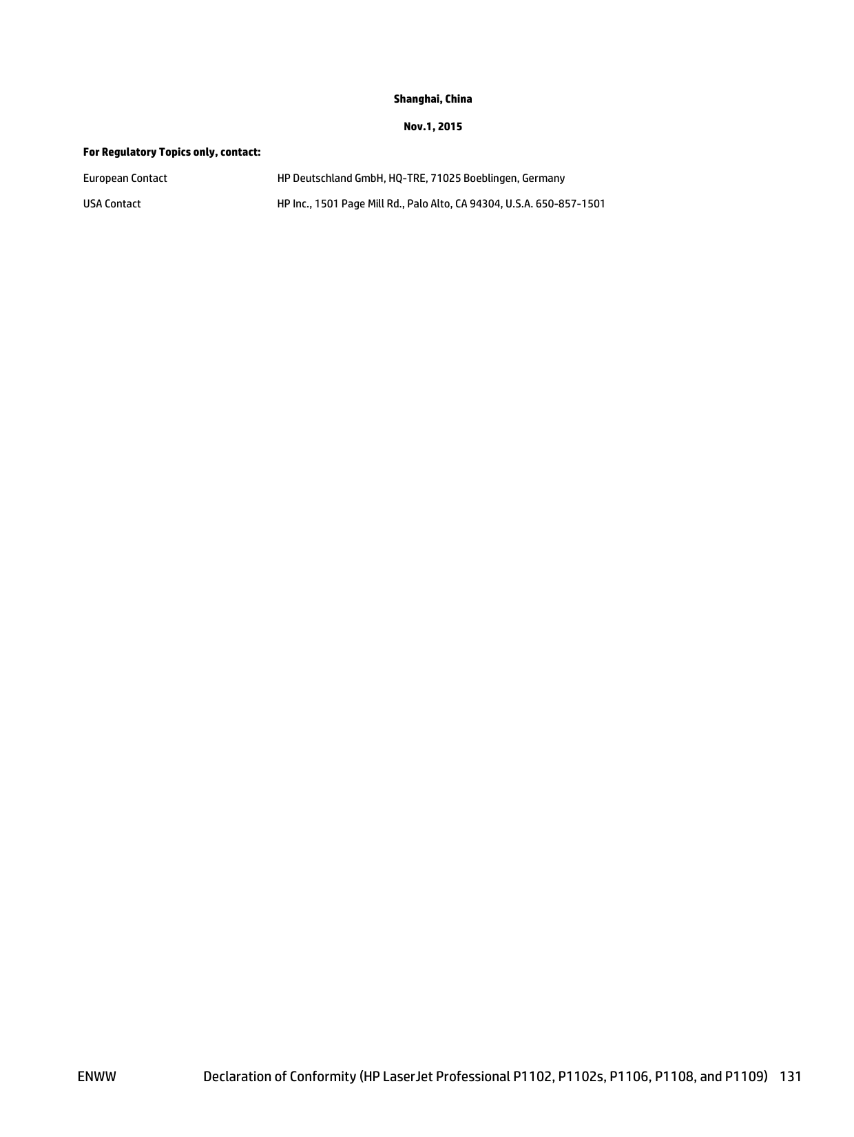Shanghai, China Nov.1, 2015 For Regulatory Topics only, contact: European Contact HP Deutschland GmbH, HQ-TRE, 71025 Boeblingen, Germany USA Contact HP Inc., 1501 Page Mill Rd., Palo Alto, CA 94304, U.S.A. 650-857-1501