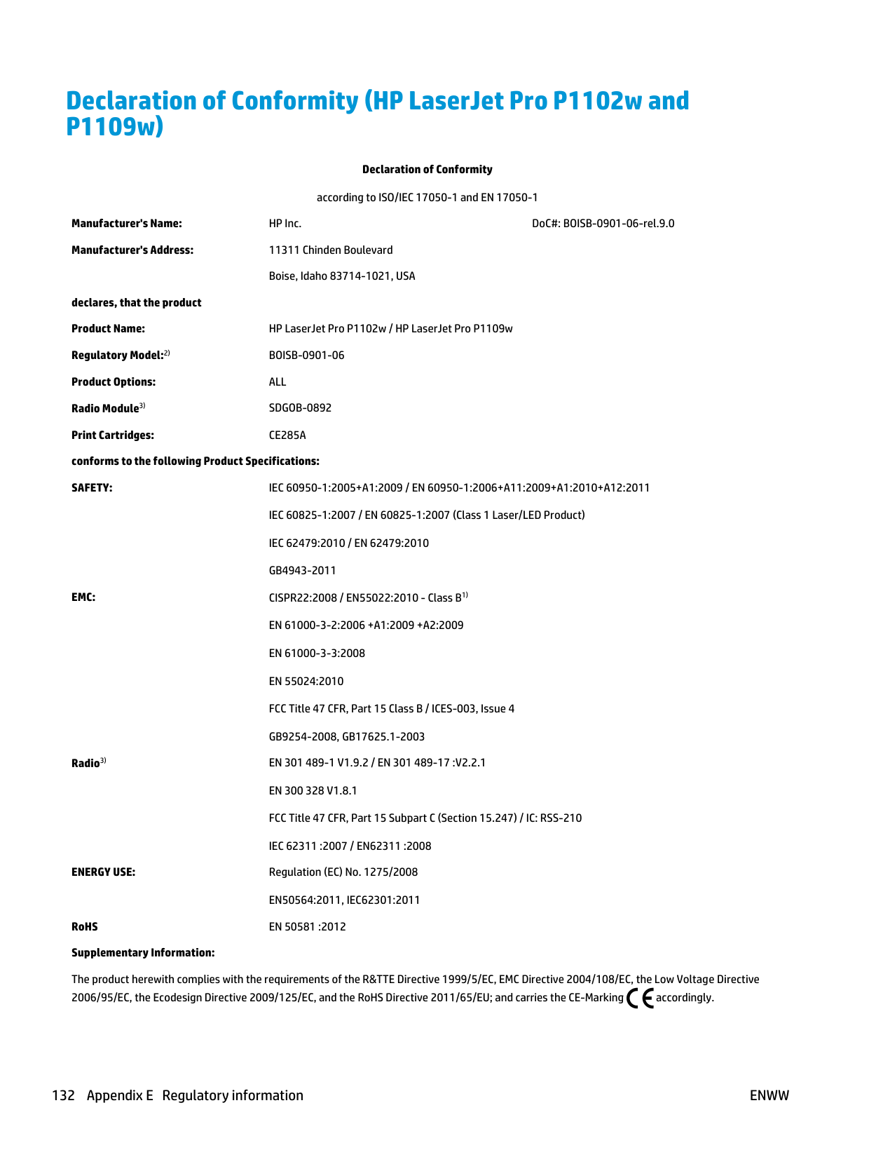 Declaration of Conformity (HP LaserJet Professional P1102, P1102s, P1106, P1108, and P1109) 131Declaration of Conformity (HP LaserJet Pro P1102w and P1109w) Declaration of Conformity according to ISO/IEC 17050-1 and EN 17050-1 Manufacturer's Name: HP Inc. DoC#: BOISB-0901-06-rel.9.0 Manufacturer's Address: 11311 Chinden Boulevard