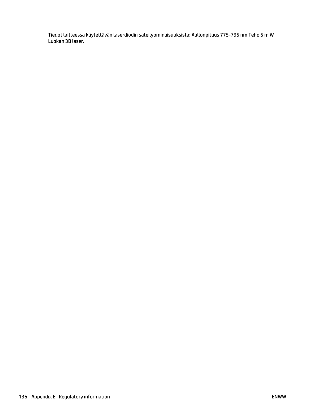 Regulatory statements 135Tiedot laitteessa käytettävän laserdiodin säteilyominaisuuksista: Aallonpituus 775-795 nm Teho 5 m W Luokan 3B laser. 136 Appendix E Regulatory information