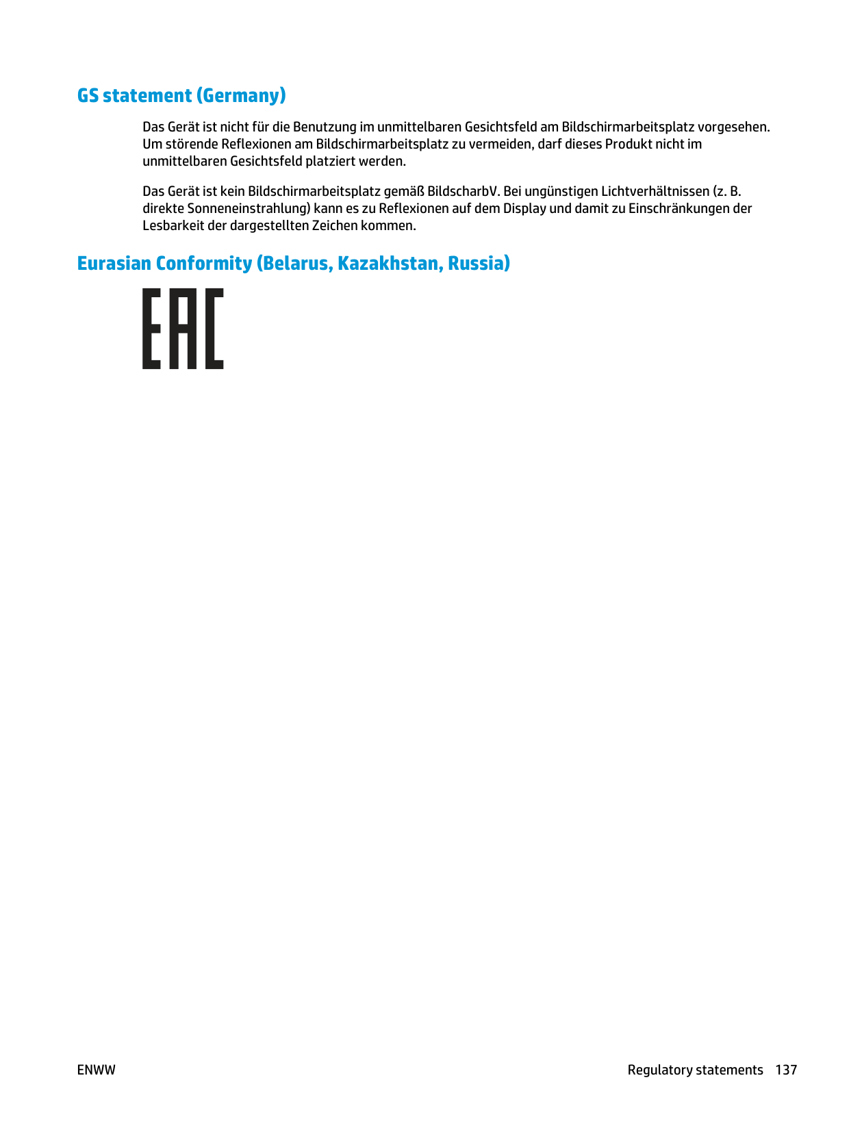 GS statement (Germany) Das Gerät ist nicht für die Benutzung im unmittelbaren Gesichtsfeld am Bildschirmarbeitsplatz vorgesehen. Um störende Reflexionen am Bildschirmarbeitsplatz zu vermeiden, darf dieses Produkt nicht im unmittelbaren Gesichtsfeld platziert werden. Das Gerät ist kein Bildschirmarbeitsplatz gemäß BildscharbV. Bei ungünstigen Lichtverhältnissen (z. B. direkte Sonneneinstrahlung) kann es zu Reflexionen auf dem Display und damit zu Einschränkungen der Lesbarkeit der dargestellten Zeichen kommen. Eurasian Conformity (Belarus, Kazakhstan, Russia)