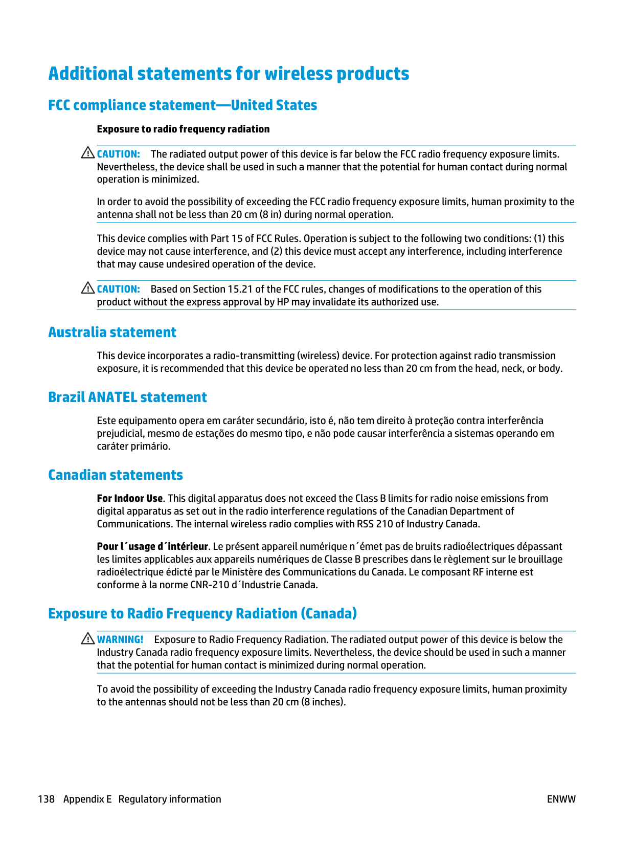 Regulatory statements 137Additional statements for wireless products FCC compliance statement—United States Exposure to radio frequency radiation