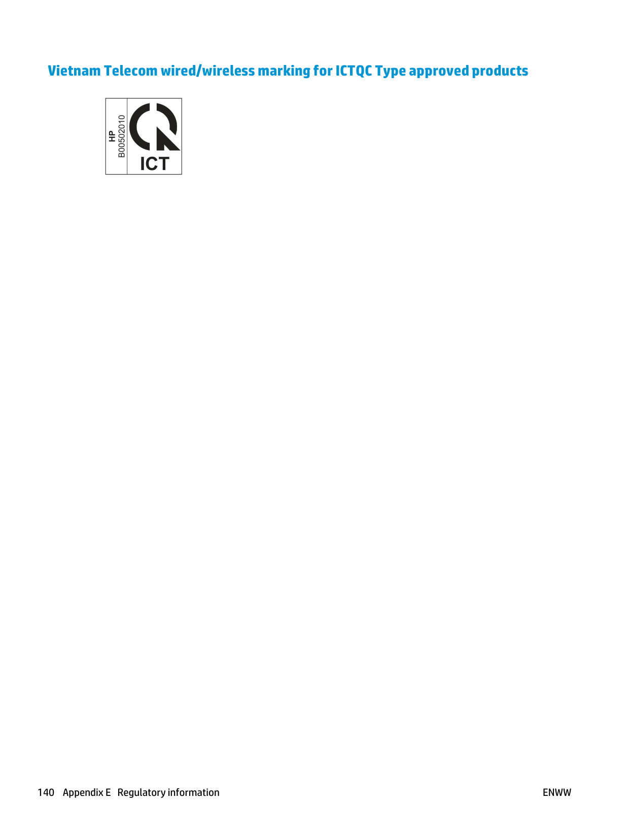 Additional statements for wireless products 139Vietnam Telecom wired/wireless marking for ICTQC Type approved products 140 Appendix E Regulatory information