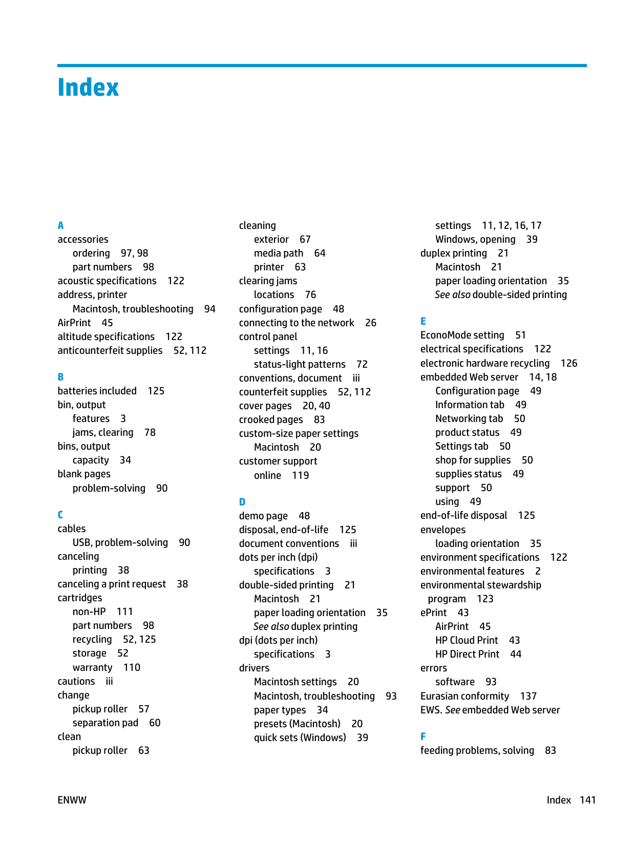 cables USB, problem-solving 90 canceling printing 38 canceling a print request 38 cartridges non-HP 111 part numbers 98 recycling 52, 125 storage 52 warranty 110 cautions iii change pickup roller 57 separation pad 60 clean pickup roller 63 cleaning exterior 67 media path 64 printer 63 clearing jams locations 76 configuration page 48 connecting to the network 26 control panel settings 11, 16 status-light patterns 72 conventions, document iii counterfeit supplies 52, 112 cover pages 20, 40 crooked pages 83 custom-size paper settings Macintosh 20 customer support online 119D