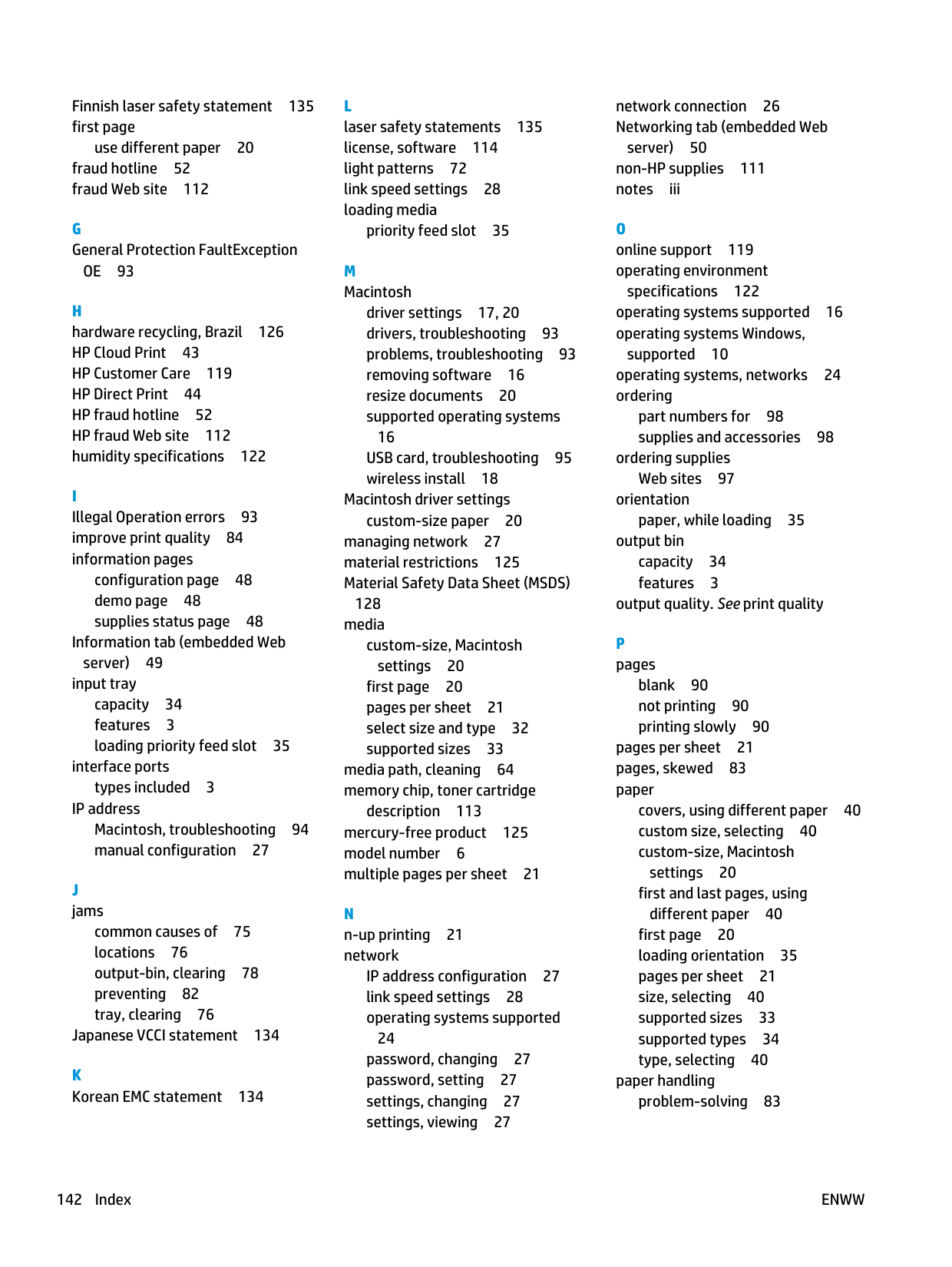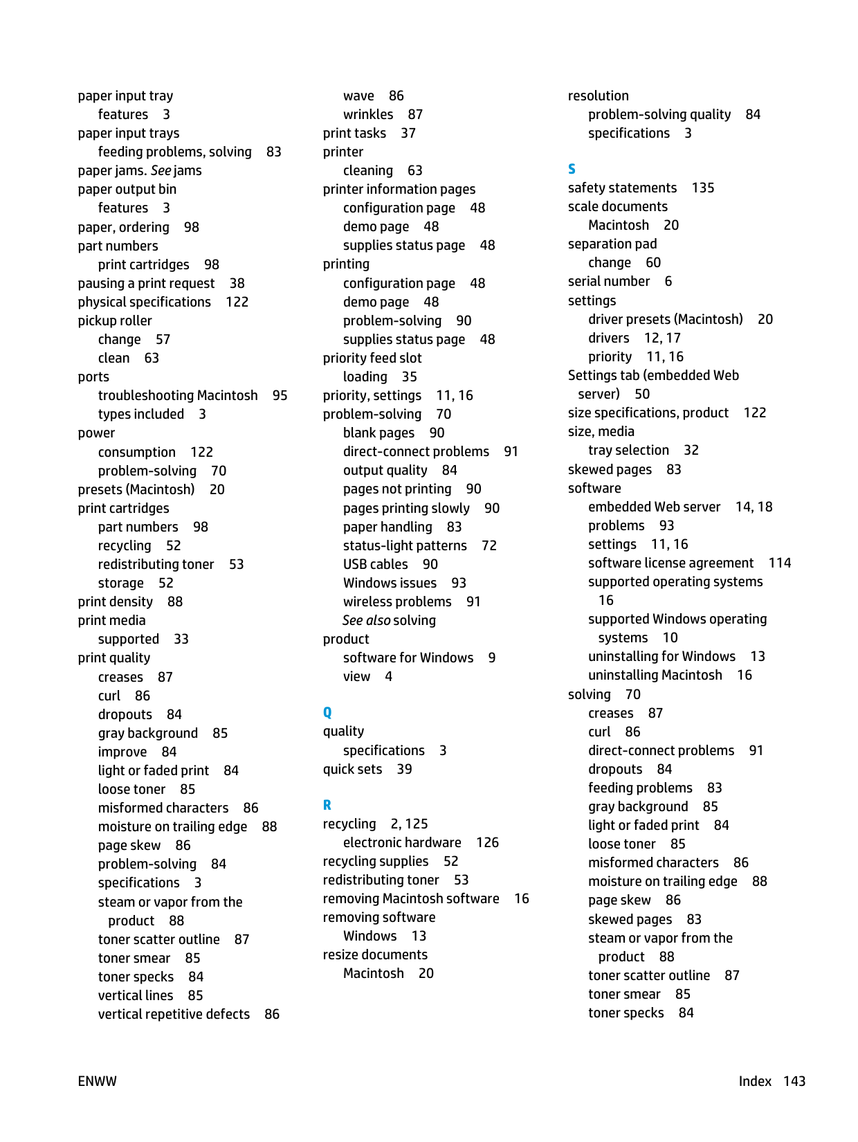 pages blank 90 not printing 90 printing slowly 90 pages per sheet 21 pages, skewed 83 paper covers, using different paper 40 custom size, selecting 40 custom-size, Macintosh settings 20 first and last pages, using different paper 40 first page 20 loading orientation 35 pages per sheet 21 size, selecting 40 supported sizes 33 supported types 34 type, selecting 40 paper handling problem-solving 83 142 IndexEnww