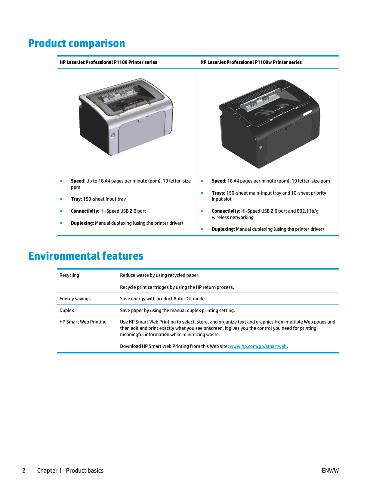1Product comparison HP LaserJet Professional P1100 Printer series HP LaserJet Professional P1100w Printer series ● Speed: Up to 18 A4 pages per minute (ppm), 19 letter-size ppm ● Tray: 150-sheet input tray ● Connectivity: Hi-Speed USB 2.0 port ● Duplexing: Manual duplexing (using the printer driver) ● Speed: 18 A4 pages per minute (ppm), 19 letter-size ppm ● Trays: 150-sheet main-input tray and 10-sheet priority input slot ● Connectivity: Hi-Speed USB 2.0 port and 802.11b/g wireless networking ● Duplexing: Manual duplexing (using the printer driver) Environmental features Recycling Reduce waste by using recycled paper. Recycle print cartridges by using the HP return process. Energy savings Save energy with product Auto-Off mode. Duplex Save paper by using the manual duplex printing setting. HP Smart Web Printing Use HP Smart Web Printing to select, store, and organize text and graphics from multiple Web pages and then edit and print exactly what you see onscreen. It gives you the control you need for printing meaningful information while minimizing waste. Download HP Smart Web Printing from this Web site: www.hp.com/go/smartweb. 2 Chapter 1 Product basics