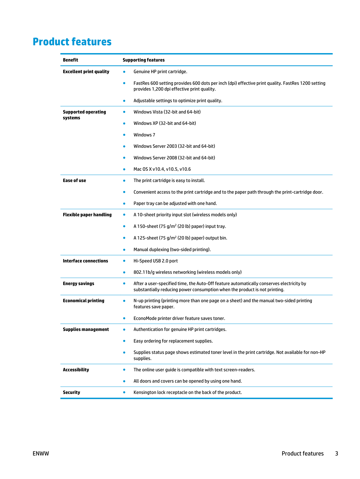 Product features Benefit Supporting features Excellent print quality ● Genuine HP print cartridge. ● FastRes 600 setting provides 600 dots per inch (dpi) effective print quality. FastRes 1200 setting provides 1,200 dpi effective print quality. ● Adjustable settings to optimize print quality. Supported operating systems ● Windows Vista (32-bit and 64-bit) ● Windows XP (32-bit and 64-bit) ● Windows 7 ● Windows Server 2003 (32-bit and 64-bit) ● Windows Server 2008 (32-bit and 64-bit) ● Mac OS X v10.4, v10.5, v10.6 Ease of use ● The print cartridge is easy to install. ● Convenient access to the print cartridge and to the paper path through the print-cartridge door. ● Paper tray can be adjusted with one hand. Flexible paper handling ● A 10-sheet priority input slot (wireless models only) ● A 150-sheet (75 g/m2 (20 lb) paper) input tray. ● A 125-sheet (75 g/m2 (20 lb) paper) output bin. ● Manual duplexing (two-sided printing). Interface connections ● Hi-Speed USB 2.0 port ● 802.11b/g wireless networking (wireless models only) Energy savings ● After a user-specified time, the Auto-Off feature automatically conserves electricity by substantially reducing power consumption when the product is not printing. Economical printing ● N-up printing (printing more than one page on a sheet) and the manual two-sided printing features save paper. ● EconoMode printer driver feature saves toner. Supplies management ● Authentication for genuine HP print cartridges. ● Easy ordering for replacement supplies. ● Supplies status page shows estimated toner level in the print cartridge. Not available for non-HP supplies. Accessibility ● The online user guide is compatible with text screen-readers. ● All doors and covers can be opened by using one hand. Security ● Kensington lock receptacle on the back of the product.