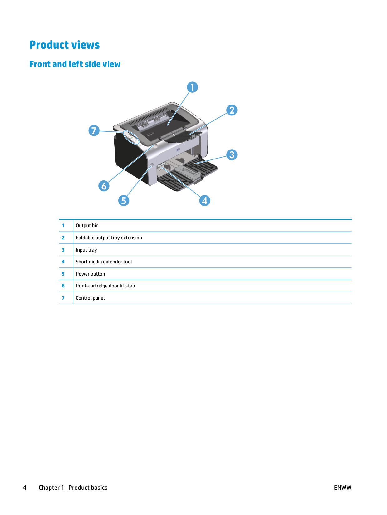Product features 3Product views Front and left side view 3 2 5 6 1 7 4 1 Output bin 2 Foldable output tray extension 3 Input tray 4 Short media extender tool 5 Power button 6 Print-cartridge door lift-tab 7 Control panel 4 Chapter 1 Product basics