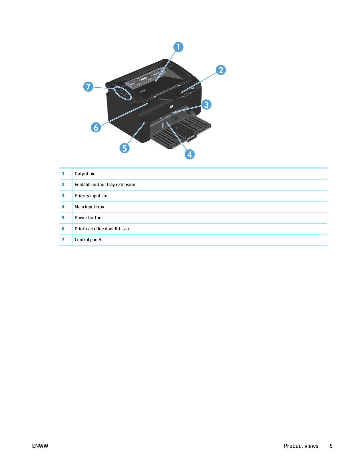 3 2 5 6 1 7 4 1 Output bin 2 Foldable output tray extension 3 Priority input slot 4 Main input tray 5 Power button 6 Print-cartridge door lift-tab 7 Control panel