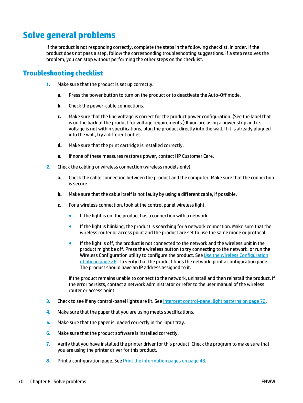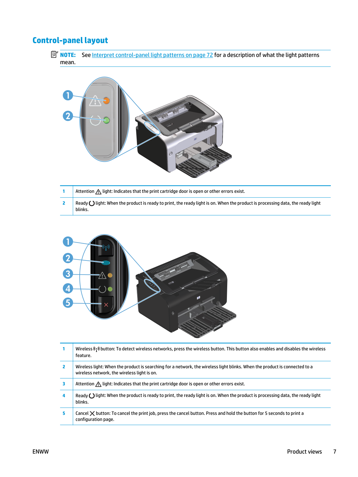 See Interpret control-panel light patterns on page 72 for a description of what the light patterns mean. 2 1 1 Attention light: Indicates that the print cartridge door is open or other errors exist. 2 Ready light: When the product is ready to print, the ready light is on. When the product is processing data, the ready light blinks. 2 3 4 5 1 1 Wireless button: To detect wireless networks, press the wireless button. This button also enables and disables the wireless feature. 2 Wireless light: When the product is searching for a network, the wireless light blinks. When the product is connected to a wireless network, the wireless light is on. 3 Attention light: Indicates that the print cartridge door is open or other errors exist. 4 Ready light: When the product is ready to print, the ready light is on. When the product is processing data, the ready light blinks. 5 Cancel button: To cancel the print job, press the cancel button. Press and hold the button for 5 seconds to print a configuration page.Enww