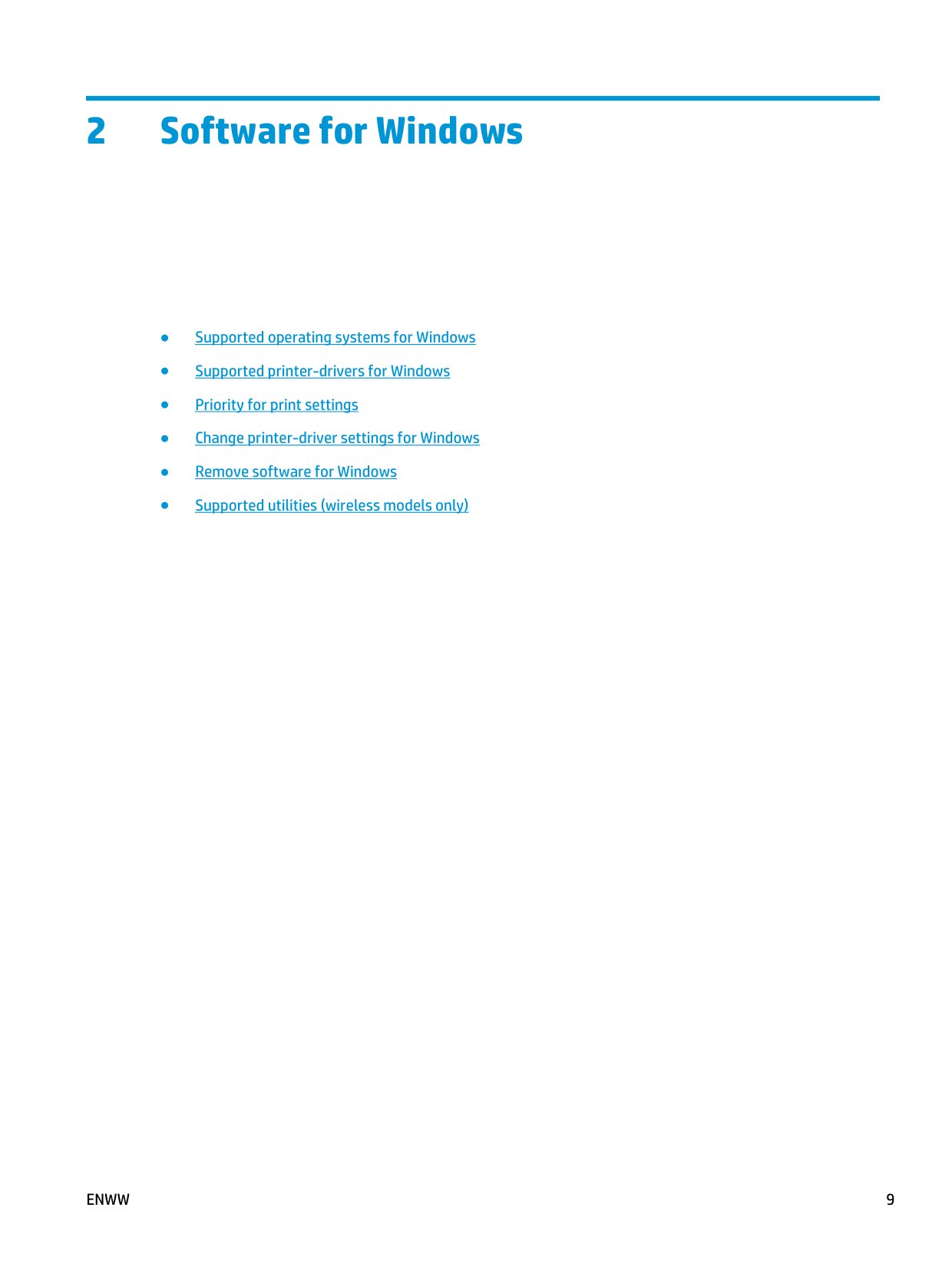 Product views 72 Software for Windows ● Supported operating systems for Windows ● Supported printer-drivers for Windows ● Priority for print settings ● Change printer-driver settings for Windows ● Remove software for Windows ● Supported utilities (wireless models only)