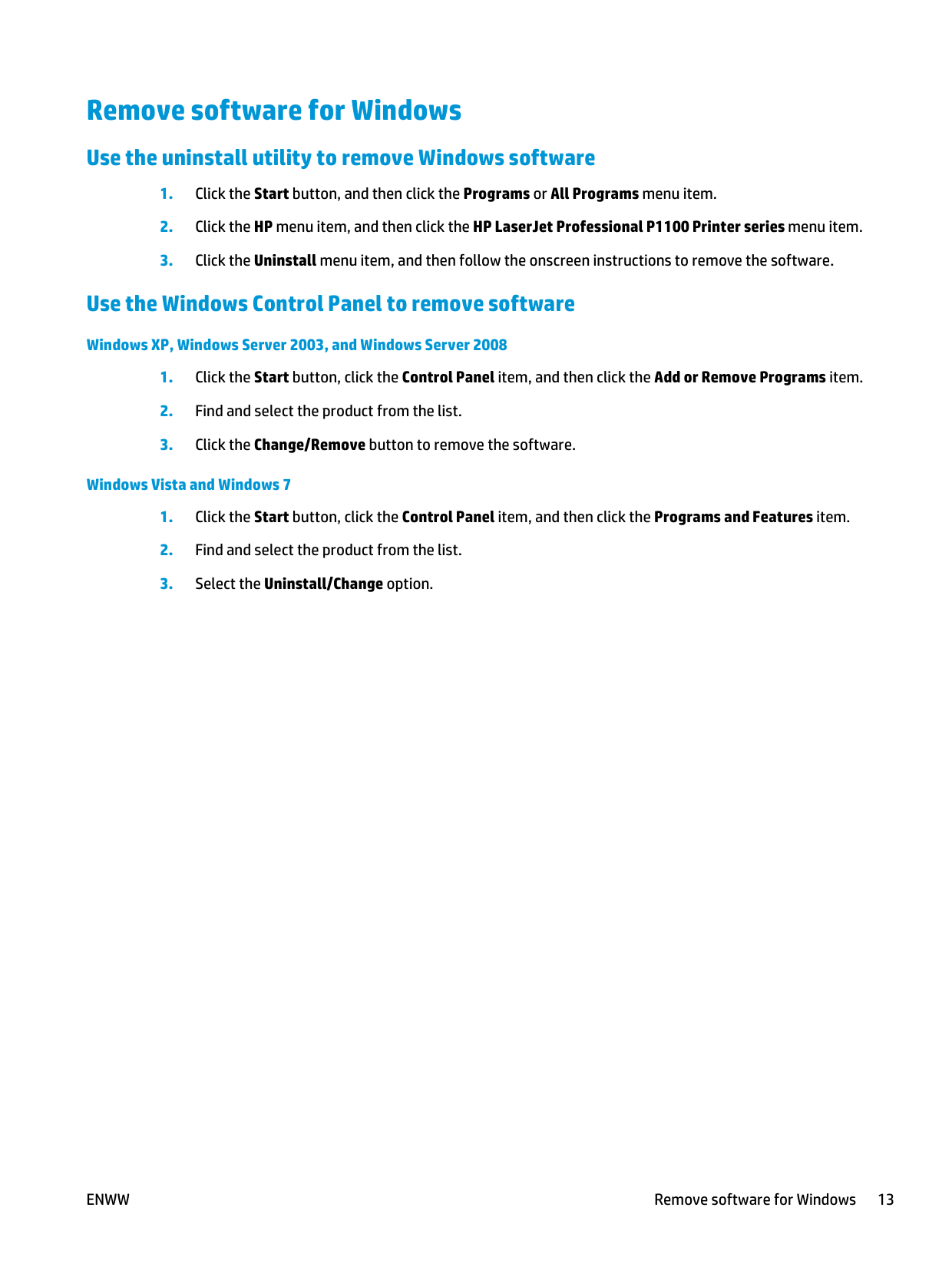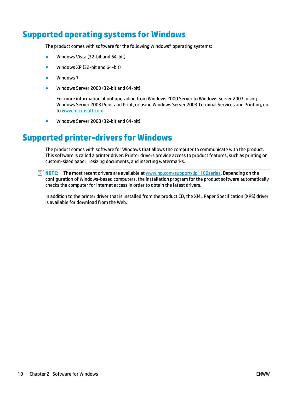 The most recent drivers are available at www.hp.com/support/ljp1100series. Depending on the configuration of Windows-based computers, the installation program for the product software automatically checks the computer for Internet access in order to obtain the latest drivers. In addition to the printer driver that is installed from the product CD, the XML Paper Specification (XPS) driver is available for download from the Web. 10 Chapter 2 Software for WindowsEnww