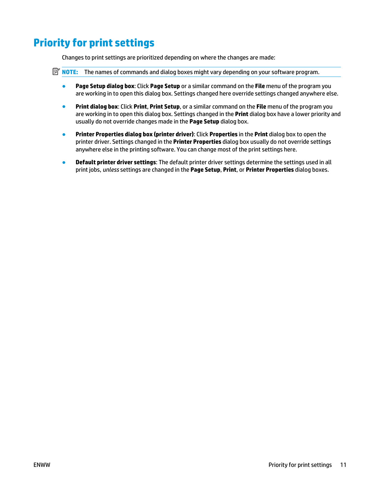 The names of commands and dialog boxes might vary depending on your software program. ● Page Setup dialog box: Click Page Setup or a similar command on the File menu of the program you are working in to open this dialog box. Settings changed here override settings changed anywhere else. ● Print dialog box: Click Print, Print Setup, or a similar command on the File menu of the program you are working in to open this dialog box. Settings changed in the Print dialog box have a lower priority and usually do not override changes made in the Page Setup dialog box. ● Printer Properties dialog box (printer driver): Click Properties in the Print dialog box to open the printer driver. Settings changed in the Printer Properties dialog box usually do not override settings anywhere else in the printing software. You can change most of the print settings here. ● Default printer driver settings: The default printer driver settings determine the settings used in all print jobs, unless settings are changed in the Page Setup, Print, or Printer Properties dialog boxes.Enww