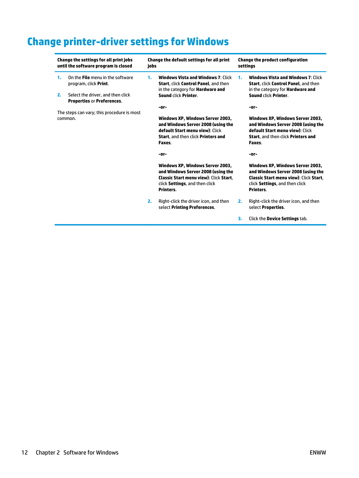 Priority for print settings 11Change printer-driver settings for Windows Change the settings for all print jobs until the software program is closed Change the default settings for all print jobs Change the product configuration settings