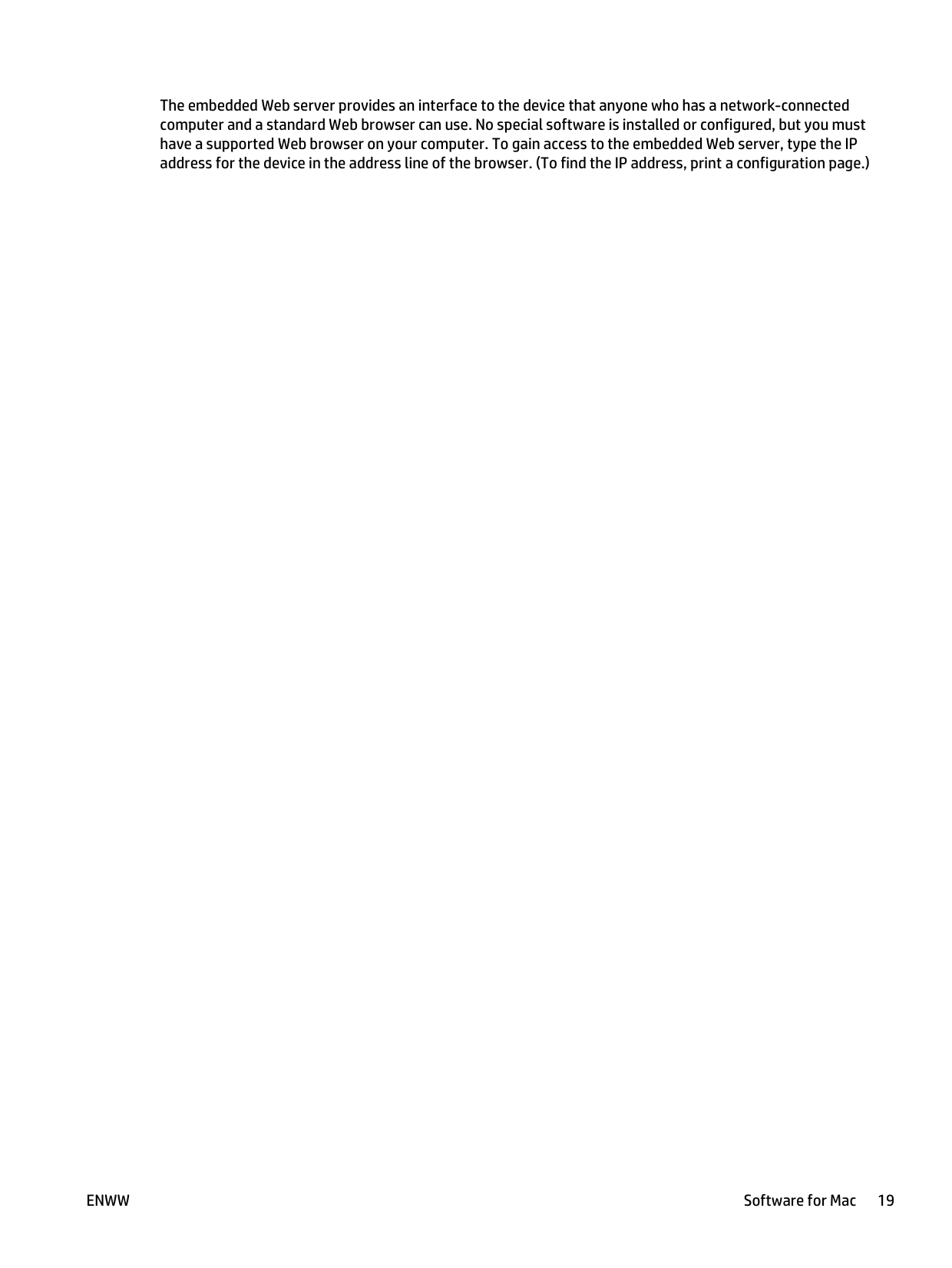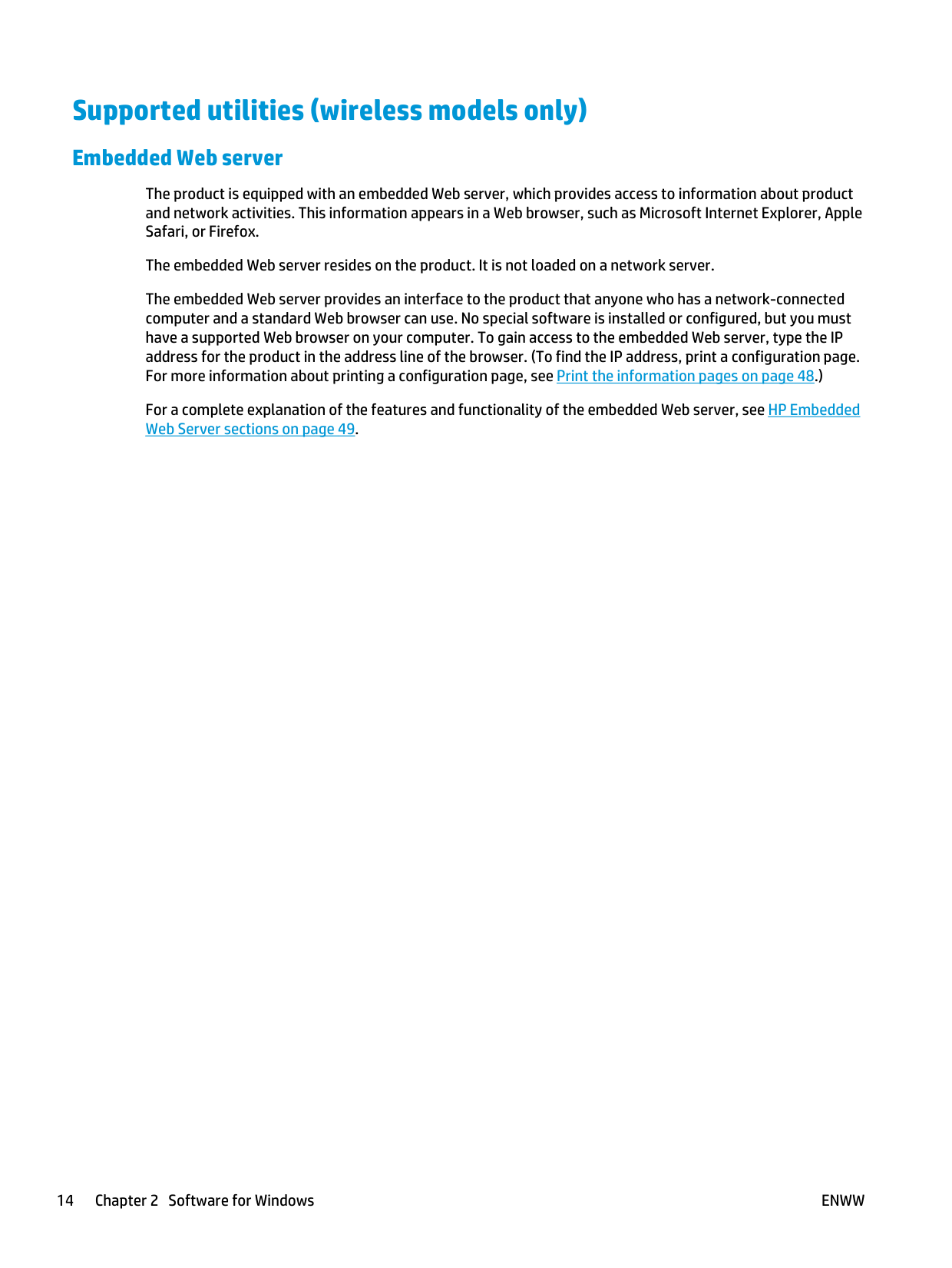 Remove software for Windows 13Supported utilities (wireless models only) Embedded Web server The product is equipped with an embedded Web server, which provides access to information about product and network activities. This information appears in a Web browser, such as Microsoft Internet Explorer, Apple Safari, or Firefox. The embedded Web server resides on the product. It is not loaded on a network server. The embedded Web server provides an interface to the product that anyone who has a network-connected computer and a standard Web browser can use. No special software is installed or configured, but you must have a supported Web browser on your computer. To gain access to the embedded Web server, type the IP address for the product in the address line of the browser. (To find the IP address, print a configuration page. For more information about printing a configuration page, see Print the information pages on page 48.) For a complete explanation of the features and functionality of the embedded Web server, see HP Embedded Web Server sections on page 49. 14 Chapter 2 Software for Windows