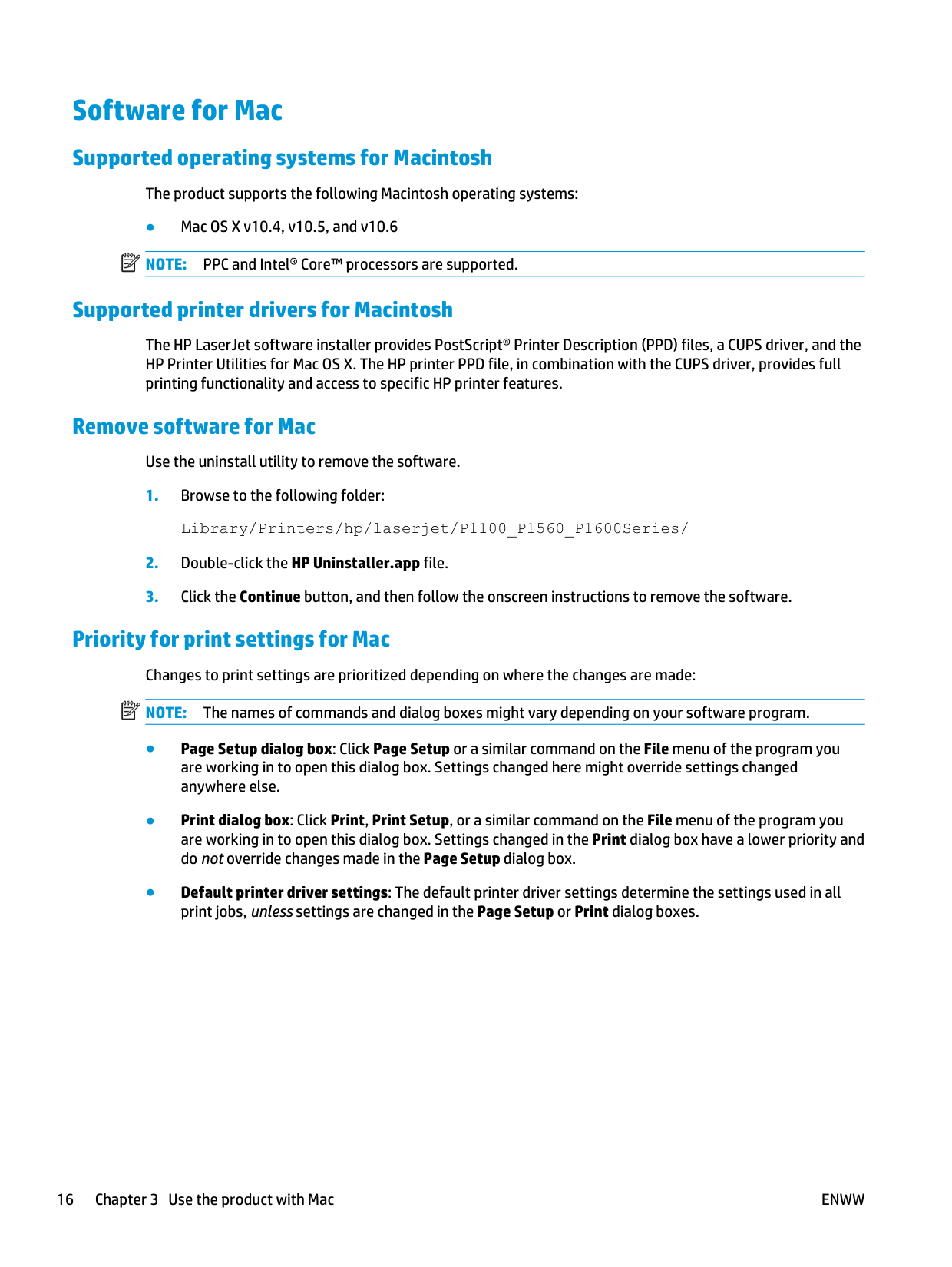 PPC and Intel® Core™ processors are supported. Supported printer drivers for Macintosh The HP LaserJet software installer provides PostScript® Printer Description (PPD) files, a CUPS driver, and the HP Printer Utilities for Mac OS X. The HP printer PPD file, in combination with the CUPS driver, provides full printing functionality and access to specific HP printer features. Remove software for Mac Use the uninstall utility to remove the software.Note: