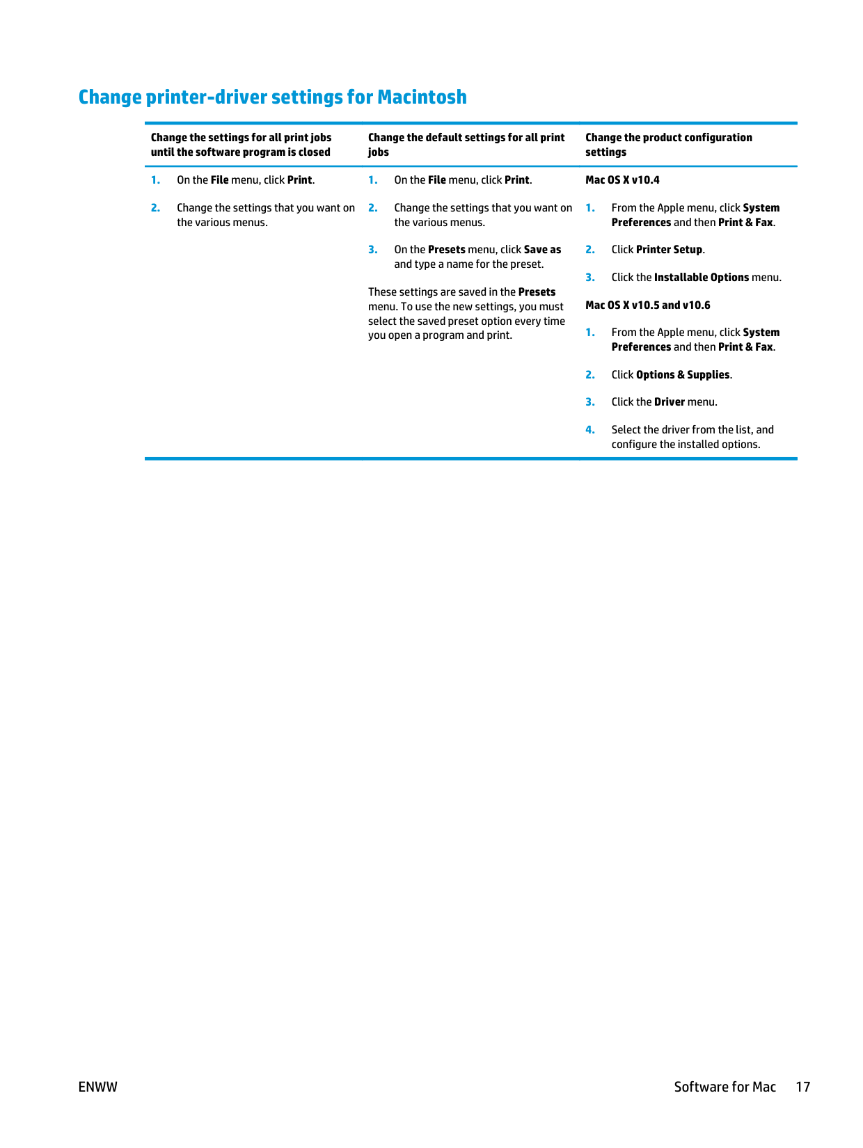 Change printer-driver settings for Macintosh Change the settings for all print jobs until the software program is closed Change the default settings for all print jobs Change the product configuration settings