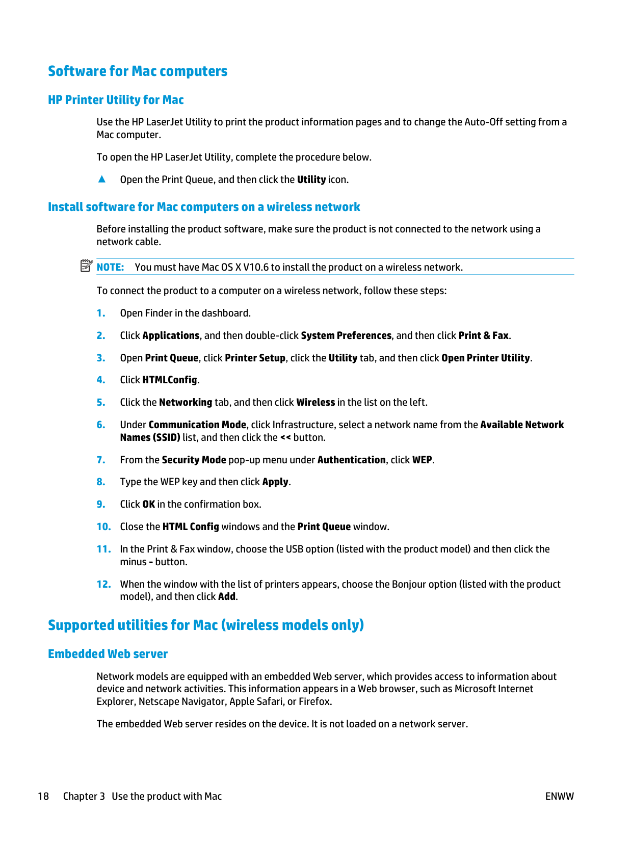 Software for Mac 17Software for Mac computers HP Printer Utility for Mac Use the HP LaserJet Utility to print the product information pages and to change the Auto-Off setting from a Mac computer. To open the HP LaserJet Utility, complete the procedure below. ▲ Open the Print Queue, and then click the Utility icon. Install software for Mac computers on a wireless network Before installing the product software, make sure the product is not connected to the network using a network cable.