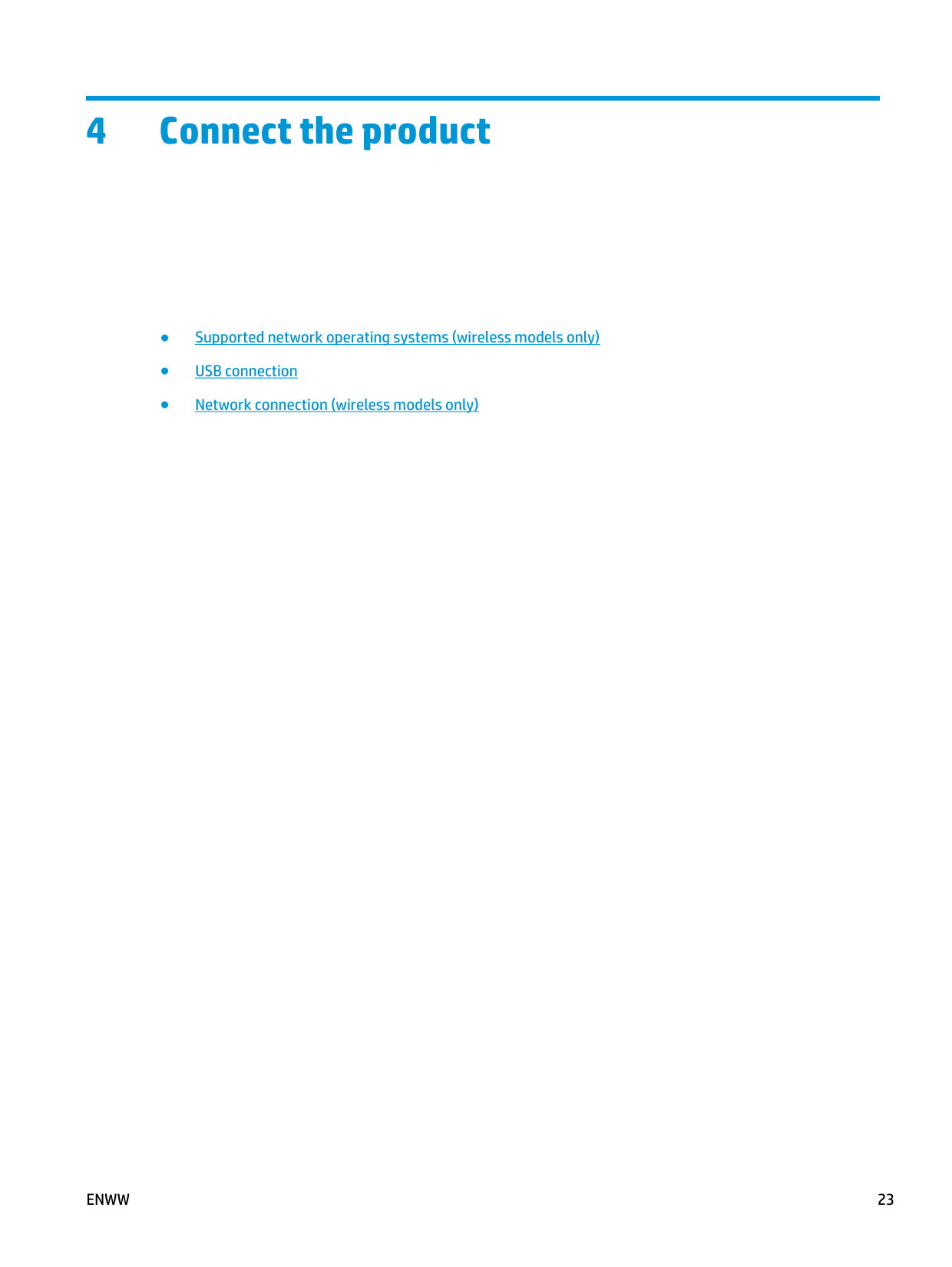 USB connection 25Network connection (wireless models only) The product can connect to wireless networks. Supported network protocols To connect a networking-equipped product to a network, you need a network that uses one of the following protocols. ● TCP/IP (IPv4 or IPv6) ● Port 9100 ●