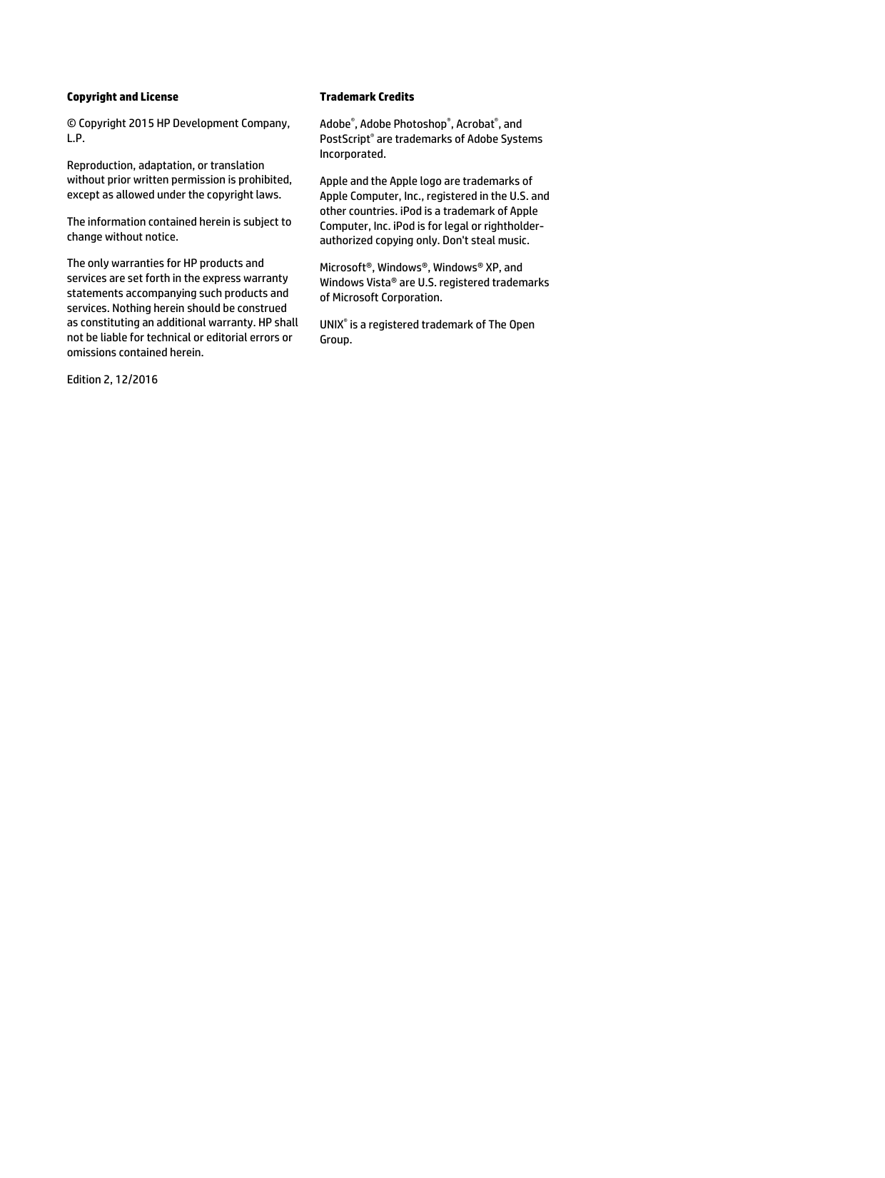 Reproduction, adaptation, or translation without prior written permission is prohibited, except as allowed under the copyright laws. The information contained herein is subject to change without notice. The only warranties for HP products and services are set forth in the express warranty statements accompanying such products and services. Nothing herein should be construed as constituting an additional warranty. HP shall not be liable for technical or editorial errors or omissions contained herein. Trademark Credits Adobe®, Adobe Photoshop®, Acrobat®, and PostScript® are trademarks of Adobe Systems Incorporated. Apple and the Apple logo are trademarks of Apple Computer, Inc., registered in the U.S. and other countries. iPod is a trademark of Apple Computer, Inc. iPod is for legal or rightholder- authorized copying only. Don't steal music. Microsoft®, Windows®, Windows® XP, and Windows Vista® are U.S. registered trademarks of Microsoft Corporation. UNIX® is a registered trademark of The Open Group. Edition 2, 12/2016Conventions used in this guide
