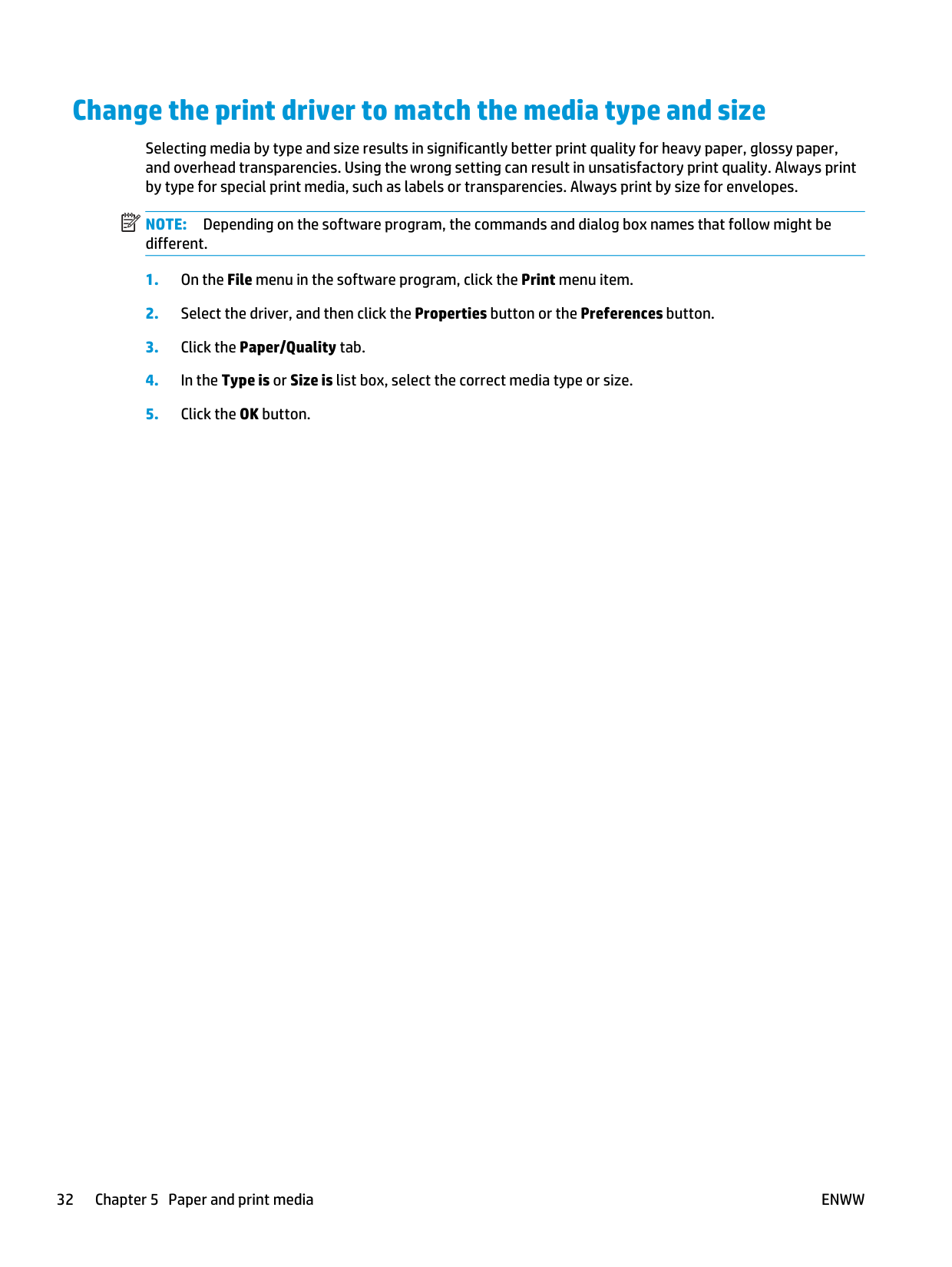 Special paper or print media guidelines 31Change the print driver to match the media type and size Selecting media by type and size results in significantly better print quality for heavy paper, glossy paper, and overhead transparencies. Using the wrong setting can result in unsatisfactory print quality. Always print by type for special print media, such as labels or transparencies. Always print by size for envelopes.