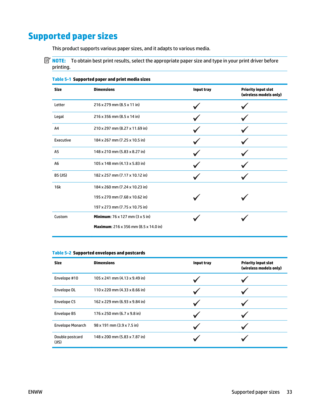 182 x 257 mm (7.17 x 10.12 in) 16k 184 x 260 mm (7.24 x 10.23 in) 195 x 270 mm (7.68 x 10.62 in) 197 x 273 mm (7.75 x 10.75 in) Custom Minimum: 76 x 127 mm (3 x 5 in) Maximum: 216 x 356 mm (8.5 x 14.0 in) Table 5-2 Supported envelopes and postcards Size Dimensions Input tray Priority input slot (wireless models only) Envelope #10 105 x 241 mm (4.13 x 9.49 in) Envelope DL 110 x 220 mm (4.33 x 8.66 in) Envelope C5 162 x 229 mm (6.93 x 9.84 in) Envelope B5 176 x 250 mm (6.7 x 9.8 in) Envelope Monarch 98 x 191 mm (3.9 x 7.5 in) Double postcard(Jis)