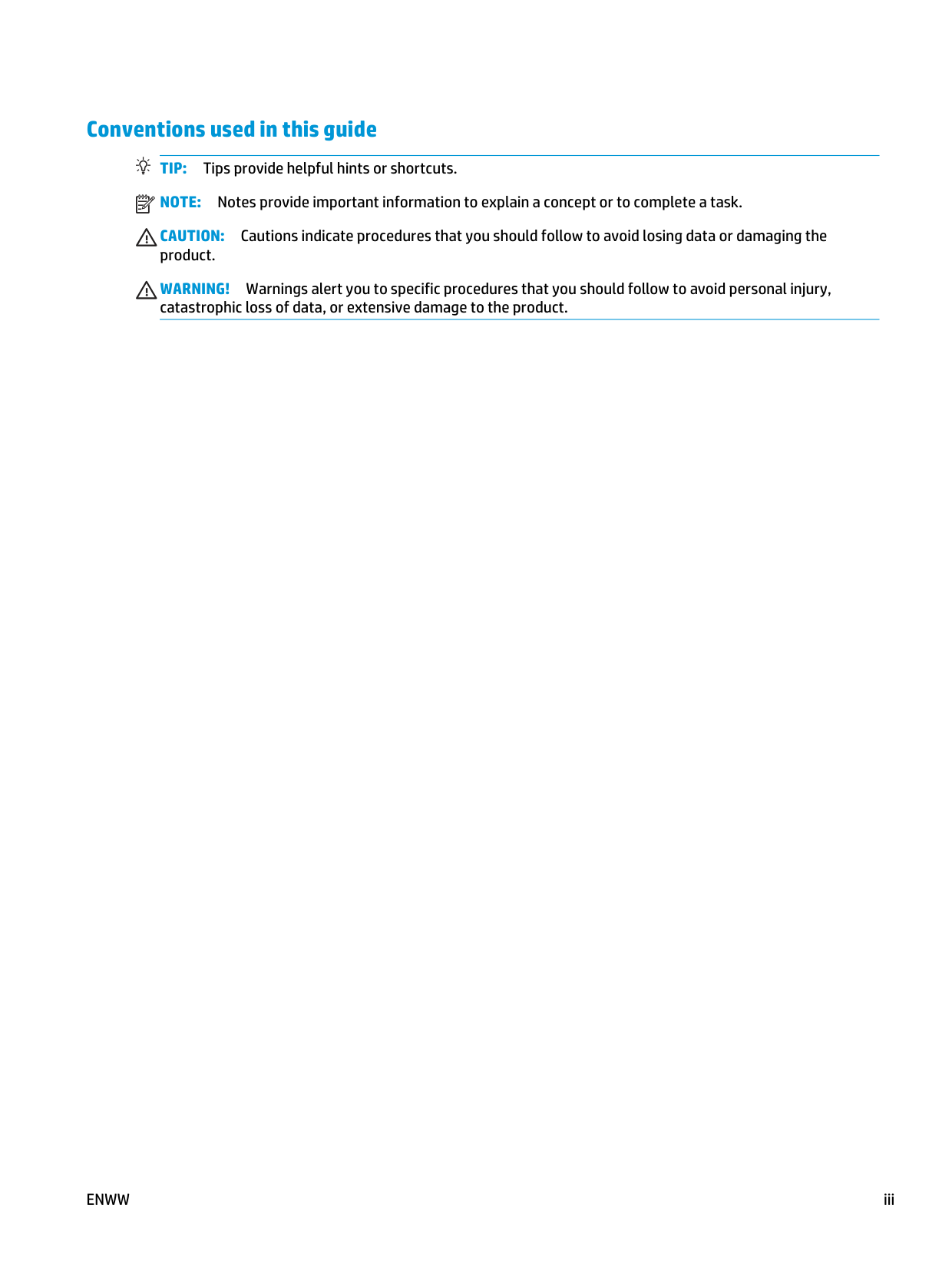 Warnings alert you to specific procedures that you should follow to avoid personal injury, catastrophic loss of data, or extensive damage to the product.Enww