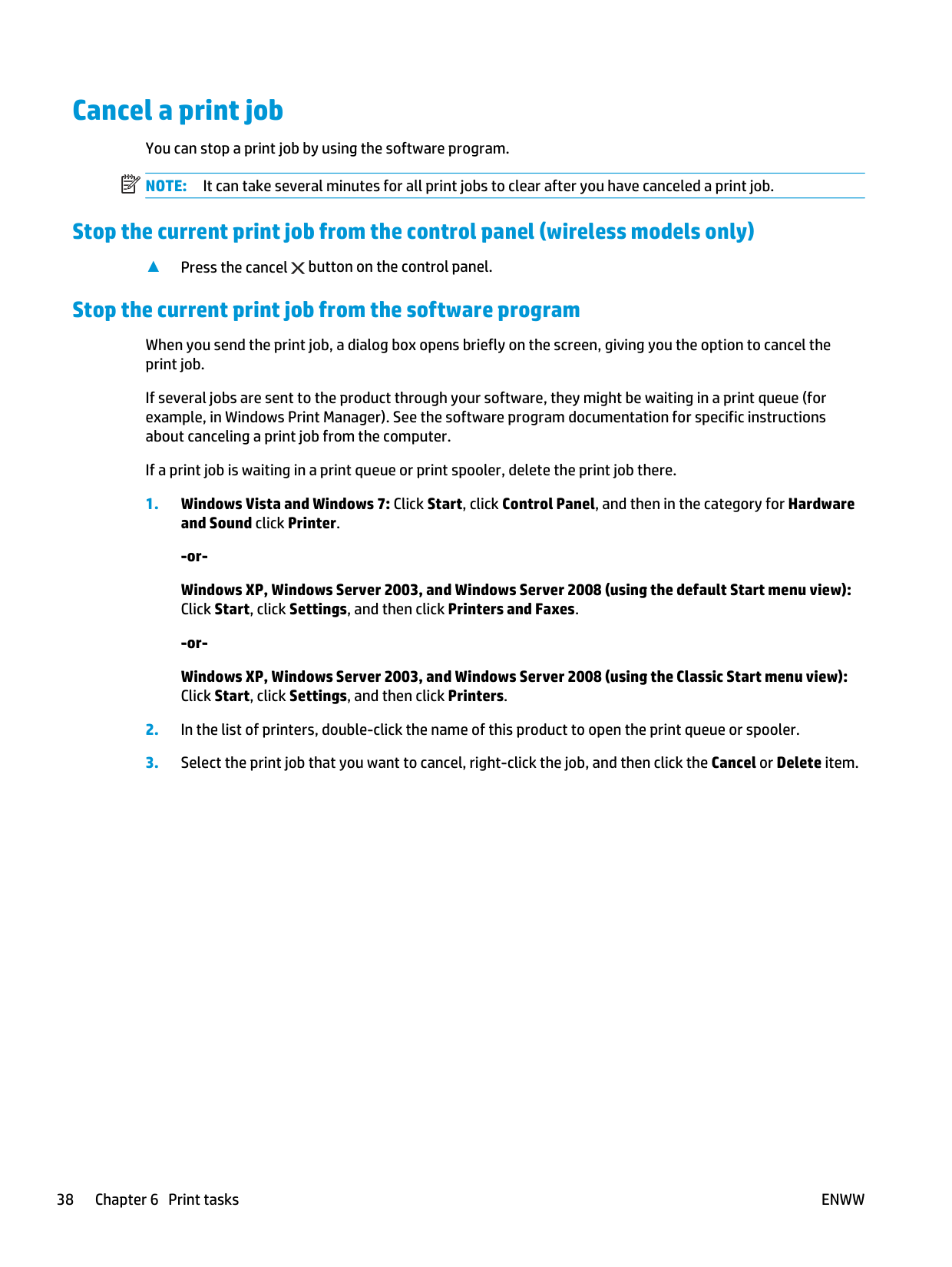 It can take several minutes for all print jobs to clear after you have canceled a print job. Stop the current print job from the control panel (wireless models only) ▲ Press the cancel button on the control panel. Stop the current print job from the software program When you send the print job, a dialog box opens briefly on the screen, giving you the option to cancel the print job. If several jobs are sent to the product through your software, they might be waiting in a print queue (for example, in Windows Print Manager). See the software program documentation for specific instructions about canceling a print job from the computer. If a print job is waiting in a print queue or print spooler, delete the print job there.Enww