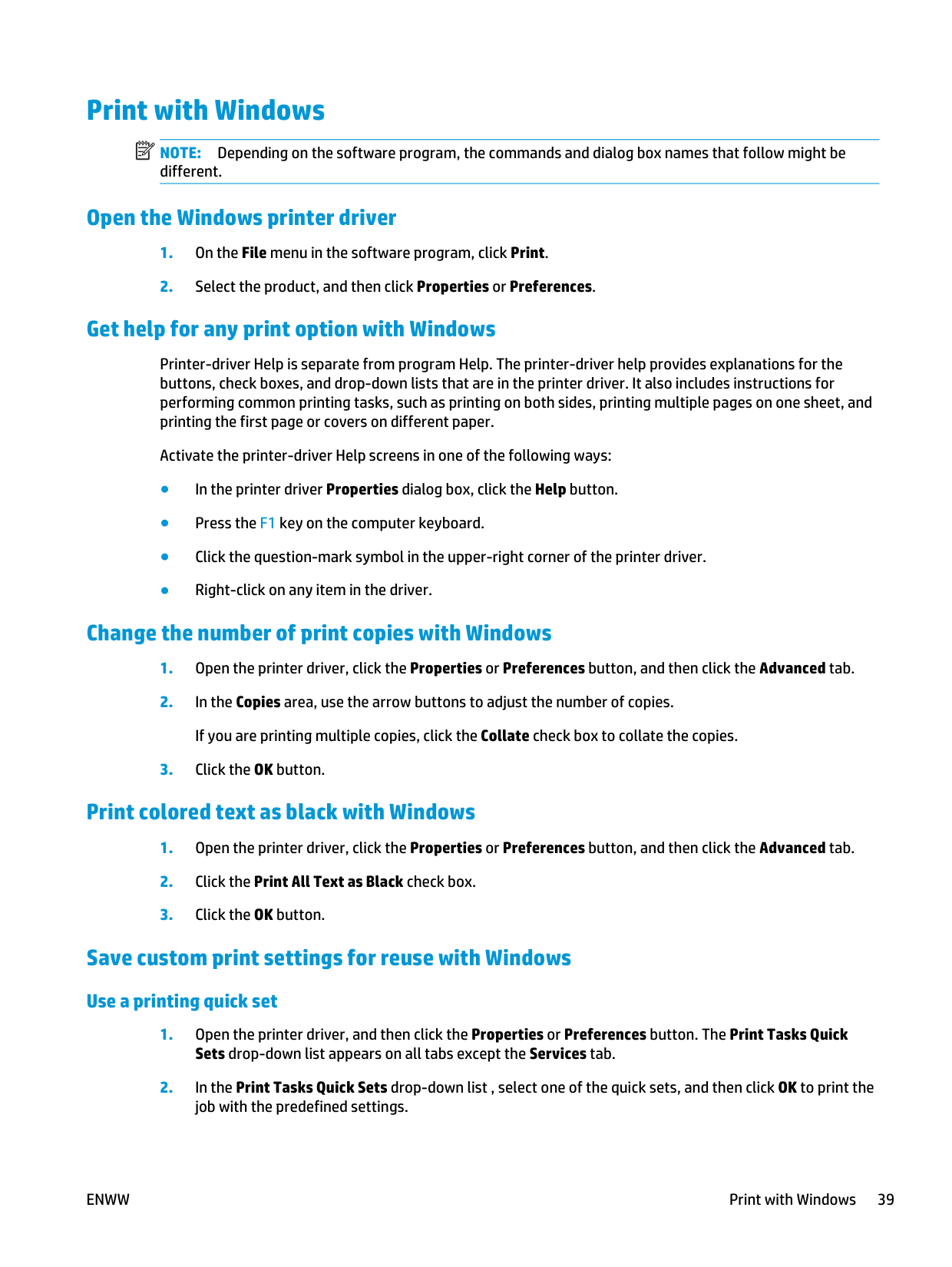 Depending on the software program, the commands and dialog box names that follow might be different. Open the Windows printer driverEnww