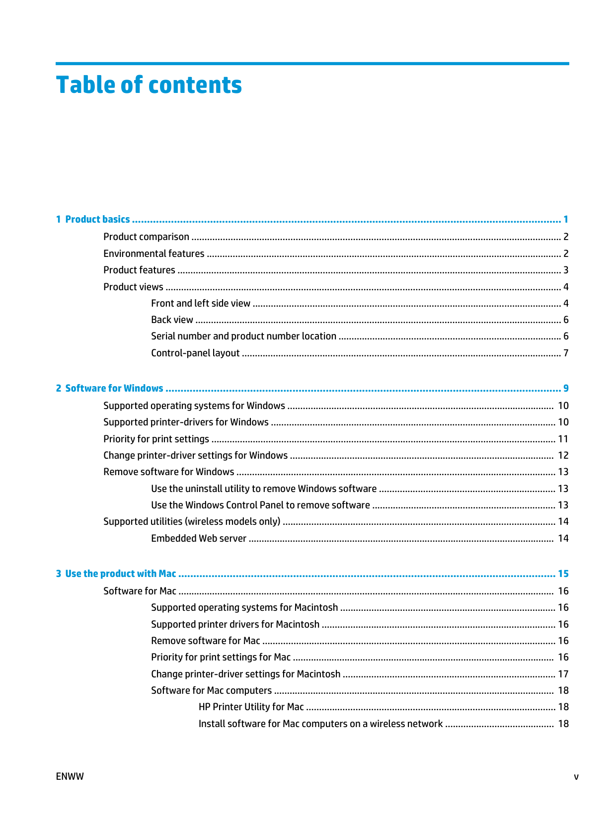 iiiTable of contents 1 Product basics ............................................................................................................................................... 1 Product comparison .............................................................................................................................................. 2 Environmental features ......................................................................................................................................... 2 Product features .................................................................................................................................................... 3 Product views ........................................................................................................................................................ 4 Front and left side view ....................................................................................................................... 4 Back view ............................................................................................................................................. 6 Serial number and product number location ...................................................................................... 6 Control-panel layout ........................................................................................................................... 7 2 Software for Windows ................................................................................................................................... 9 Supported operating systems for Windows ....................................................................................................... 10 Supported printer-drivers for Windows .............................................................................................................. 10 Priority for print settings ..................................................................................................................................... 11 Change printer-driver settings for Windows ...................................................................................................... 12 Remove software for Windows ........................................................................................................................... 13 Use the uninstall utility to remove Windows software .................................................................... 13 Use the Windows Control Panel to remove software ....................................................................... 13 Supported utilities (wireless models only) ......................................................................................................... 14 Embedded Web server ...................................................................................................................... 14 3 Use the product with Mac ............................................................................................................................. 15 Software for Mac ................................................................................................................................................. 16 Supported operating systems for Macintosh ................................................................................... 16 Supported printer drivers for Macintosh .......................................................................................... 16 Remove software for Mac ................................................................................................................. 16 Priority for print settings for Mac ..................................................................................................... 16 Change printer-driver settings for Macintosh .................................................................................. 17 Software for Mac computers ............................................................................................................ 18 HP Printer Utility for Mac ................................................................................................ 18 Install software for Mac computers on a wireless network .......................................... 18
