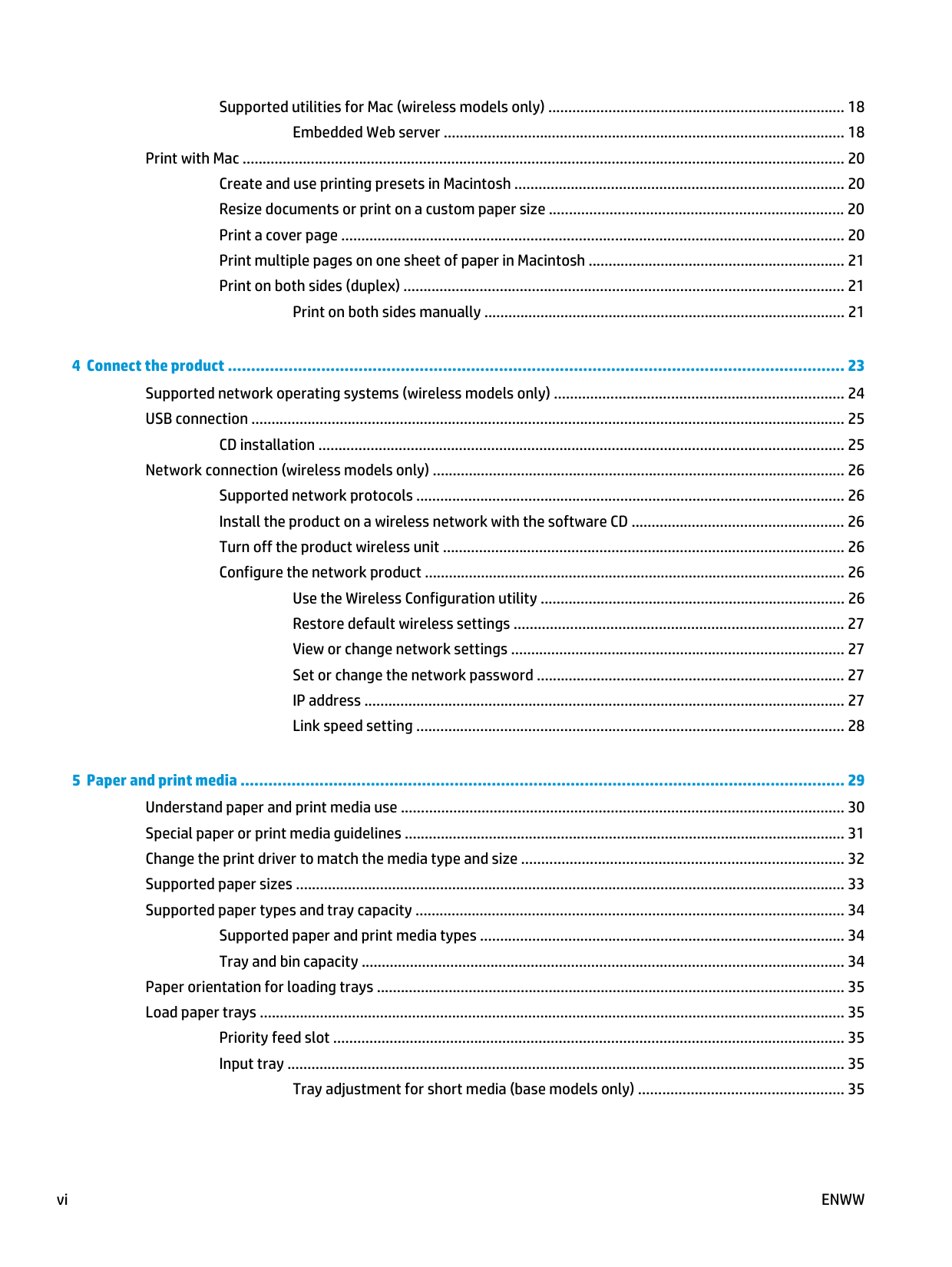 vSupported utilities for Mac (wireless models only) .......................................................................... 18 Embedded Web server .................................................................................................... 18 Print with Mac ...................................................................................................................................................... 20 Create and use printing presets in Macintosh .................................................................................. 20 Resize documents or print on a custom paper size ......................................................................... 20 Print a cover page ............................................................................................................................. 20 Print multiple pages on one sheet of paper in Macintosh ................................................................ 21 Print on both sides (duplex) .............................................................................................................. 21 Print on both sides manually .......................................................................................... 21 4 Connect the product .................................................................................................................................... 23 Supported network operating systems (wireless models only) ........................................................................ 24 USB connection .................................................................................................................................................... 25 CD installation ................................................................................................................................... 25 Network connection (wireless models only) ....................................................................................................... 26 Supported network protocols ........................................................................................................... 26 Install the product on a wireless network with the software CD ..................................................... 26 Turn off the product wireless unit .................................................................................................... 26 Configure the network product ......................................................................................................... 26 Use the Wireless Configuration utility ............................................................................ 26 Restore default wireless settings .................................................................................. 27 View or change network settings ................................................................................... 27 Set or change the network password ............................................................................. 27 IP address ........................................................................................................................ 27 Link speed setting ........................................................................................................... 28 5 Paper and print media .................................................................................................................................. 29 Understand paper and print media use .............................................................................................................. 30 Special paper or print media guidelines .............................................................................................................. 31 Change the print driver to match the media type and size ................................................................................ 32 Supported paper sizes ......................................................................................................................................... 33 Supported paper types and tray capacity ........................................................................................................... 34 Supported paper and print media types ........................................................................................... 34 Tray and bin capacity ........................................................................................................................ 34 Paper orientation for loading trays ..................................................................................................................... 35 Load paper trays .................................................................................................................................................. 35 Priority feed slot ............................................................................................................................... 35 Input tray ........................................................................................................................................... 35 Tray adjustment for short media (base models only) ................................................... 35 vi
