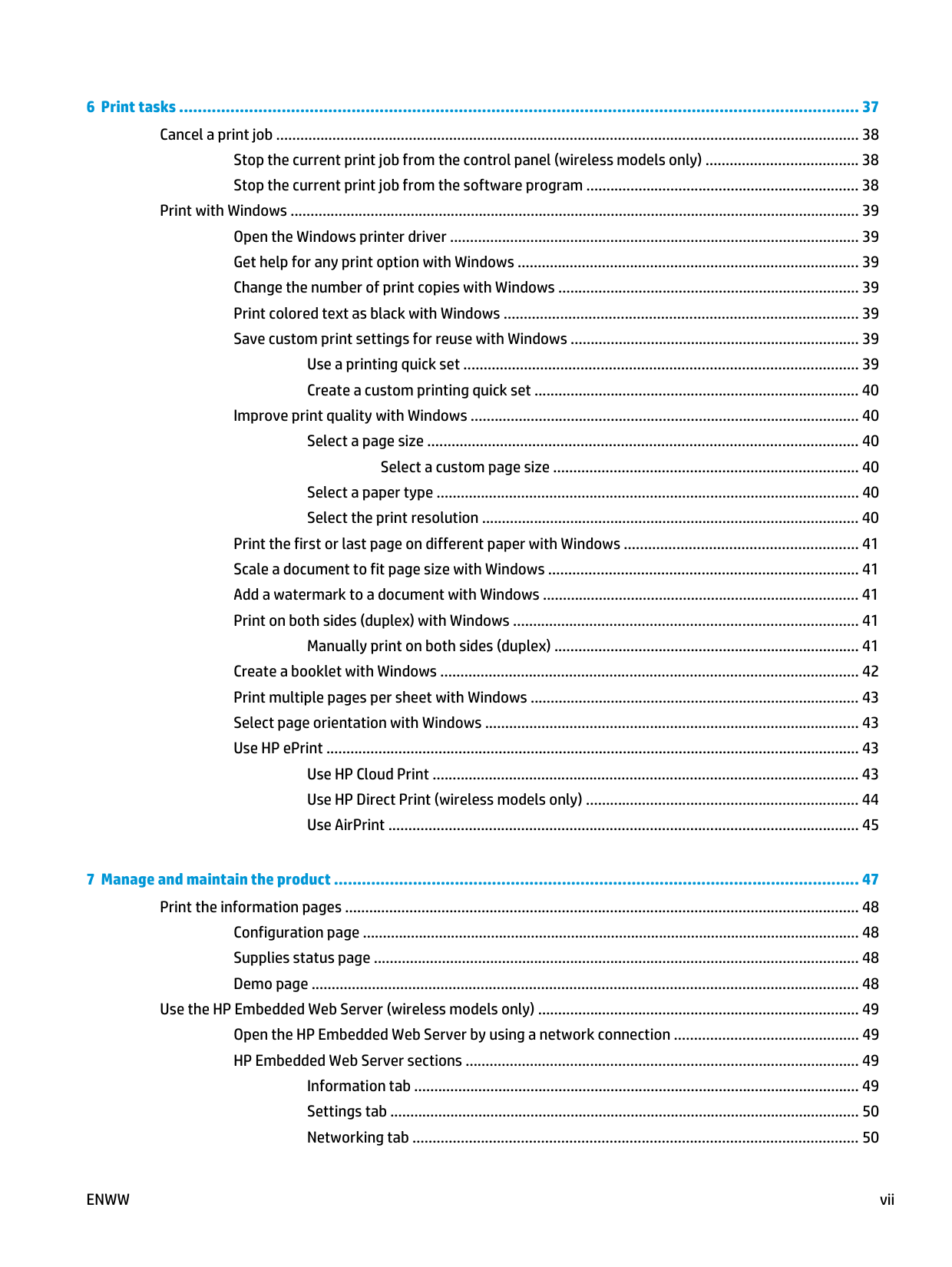 6 Print tasks .................................................................................................................................................. 37 Cancel a print job ................................................................................................................................................. 38 Stop the current print job from the control panel (wireless models only) ...................................... 38 Stop the current print job from the software program .................................................................... 38 Print with Windows .............................................................................................................................................. 39 Open the Windows printer driver ...................................................................................................... 39 Get help for any print option with Windows ..................................................................................... 39 Change the number of print copies with Windows ........................................................................... 39 Print colored text as black with Windows ........................................................................................ 39 Save custom print settings for reuse with Windows ........................................................................ 39 Use a printing quick set .................................................................................................. 39 Create a custom printing quick set ................................................................................. 40 Improve print quality with Windows ................................................................................................. 40 Select a page size ........................................................................................................... 40 Select a custom page size ............................................................................ 40 Select a paper type ......................................................................................................... 40 Select the print resolution .............................................................................................. 40 Print the first or last page on different paper with Windows .......................................................... 41 Scale a document to fit page size with Windows ............................................................................. 41 Add a watermark to a document with Windows ............................................................................... 41 Print on both sides (duplex) with Windows ...................................................................................... 41 Manually print on both sides (duplex) ............................................................................ 41 Create a booklet with Windows ........................................................................................................ 42 Print multiple pages per sheet with Windows .................................................................................. 43 Select page orientation with Windows ............................................................................................. 43 Use HP ePrint ..................................................................................................................................... 43 Use HP Cloud Print .......................................................................................................... 43 Use HP Direct Print (wireless models only) .................................................................... 44 Use AirPrint ..................................................................................................................... 45 7 Manage and maintain the product ................................................................................................................. 47 Print the information pages ................................................................................................................................ 48 Configuration page ............................................................................................................................ 48 Supplies status page ......................................................................................................................... 48 Demo page ........................................................................................................................................ 48 Use the HP Embedded Web Server (wireless models only) ................................................................................ 49 Open the HP Embedded Web Server by using a network connection .............................................. 49 HP Embedded Web Server sections .................................................................................................. 49 Information tab ............................................................................................................... 49 Settings tab ..................................................................................................................... 50 Networking tab ............................................................................................................... 50