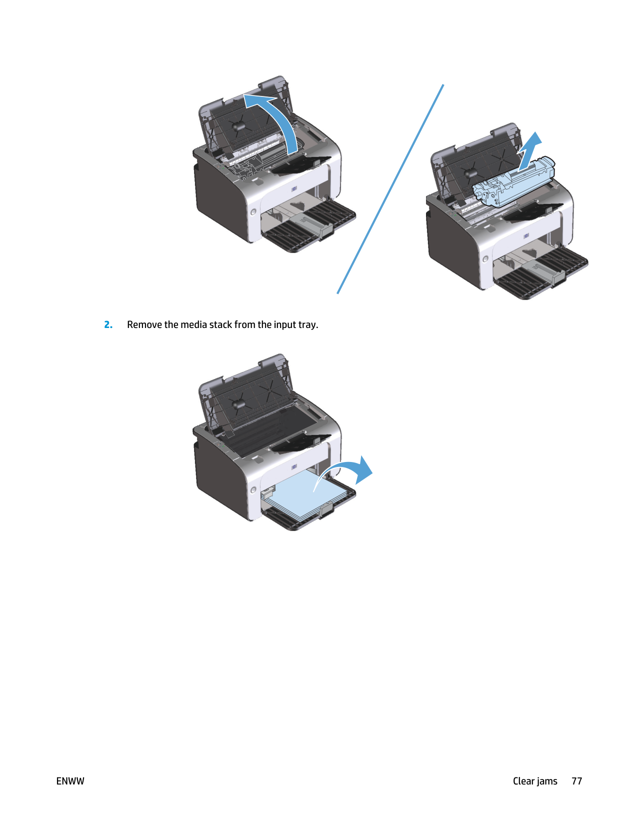 When you add new media, make sure that you remove all of the media from the input tray and straighten the entire stack. This helps prevent multiple sheets of media from feeding through the product at one time, reducing media jams. Tray adjustment for short media (base models only) To print on media shorter than 185 mm (7.28 in), use the short media extender to adjust your input tray.Enww