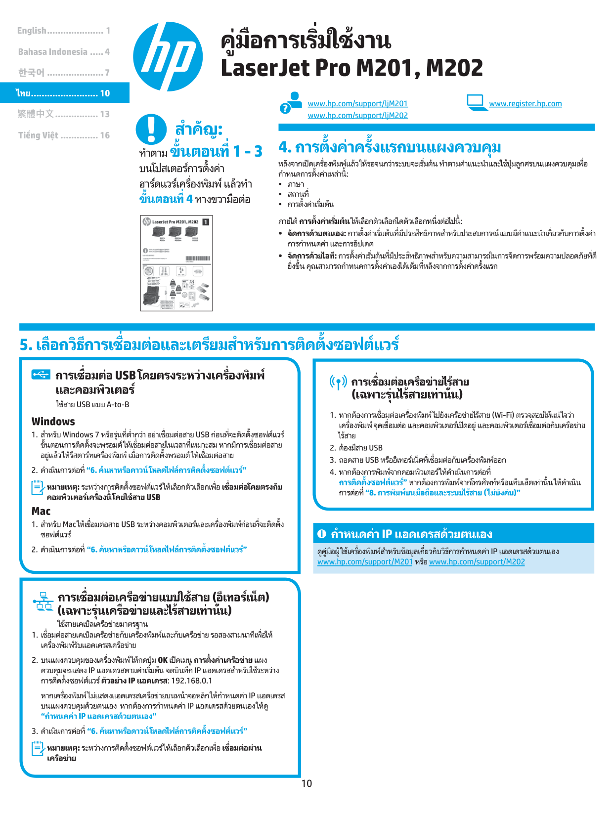 10 ไทย.......................... 10 한국어...................... 7 Bahasa Indonesia...... 4 English...................... 1 Tiếng Việt............... 16 繁體中文................. 13 www.hp.com/support/ljM201 www.register.hp.com www.hp.com/support/ljM202
