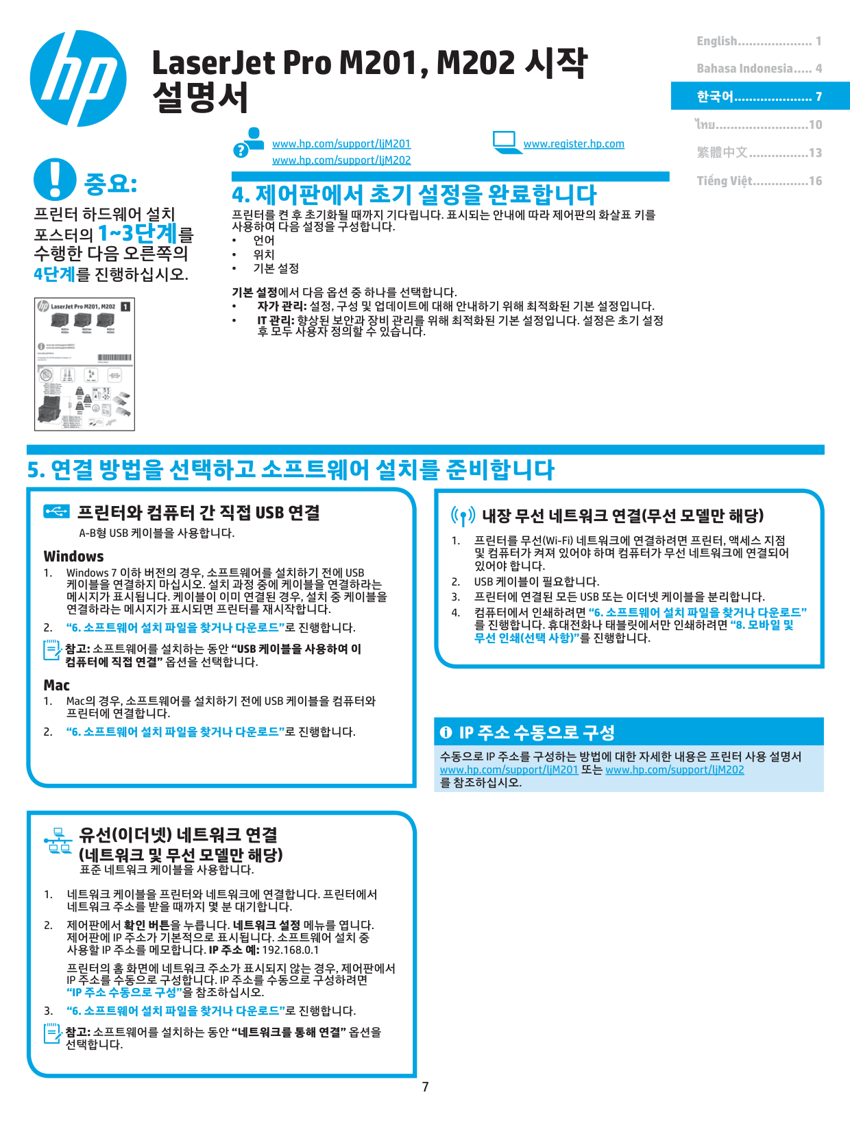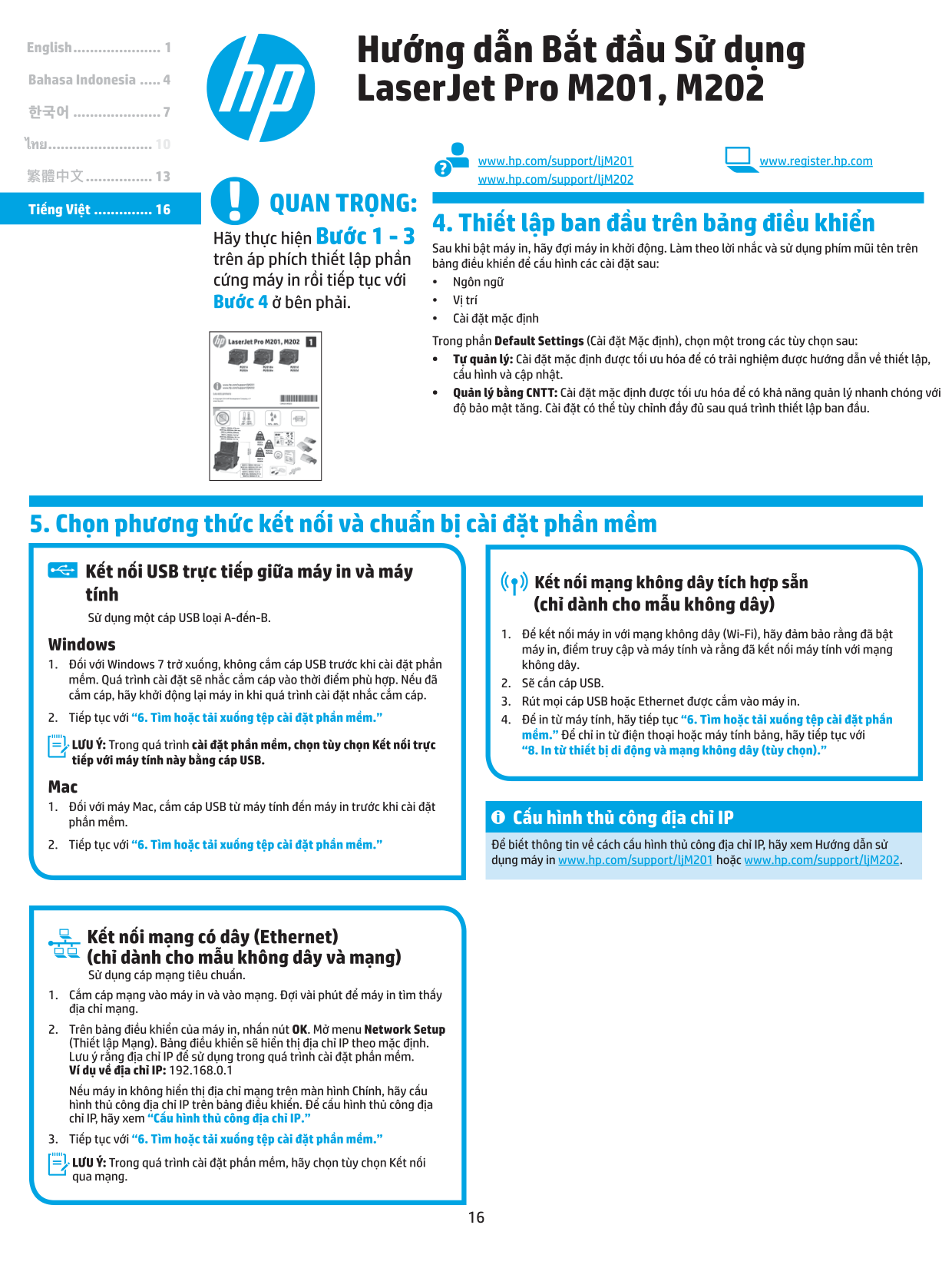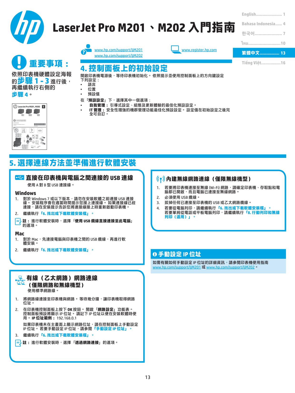 16 ไทย.......................... 10 한국어...................... 7 Bahasa Indonesia...... 4 English...................... 1 Tiếng Việt............... 16 繁體中文................. 13 www.hp.com/support/ljM201 www.register.hp.com www.hp.com/support/ljM202
