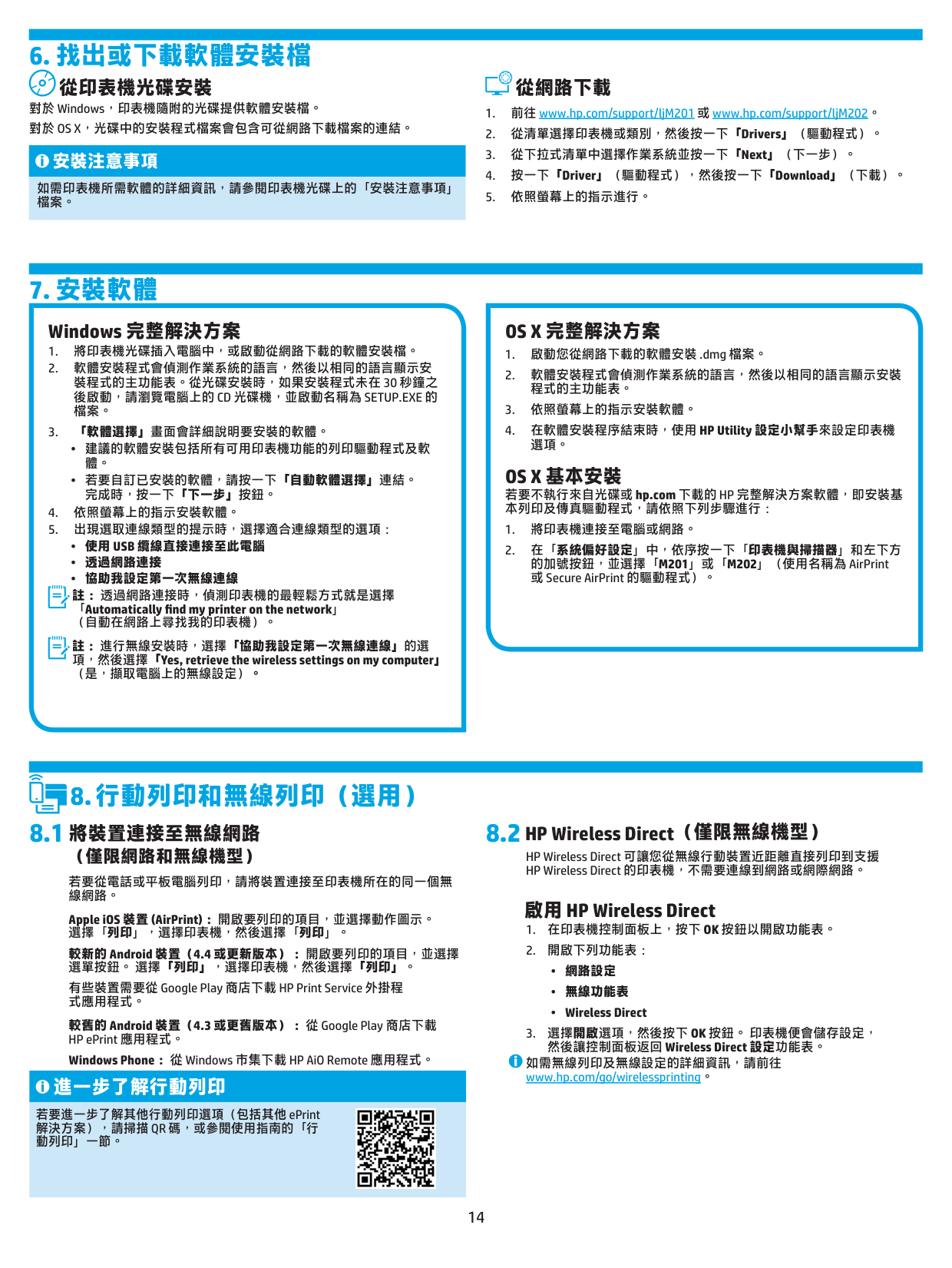 安裝注意事項 如需印表機所需軟體的詳細資訊,請參閱印表機光碟上的「安裝注意事項」 檔案。 從網路下載(僅限網路和無線機型) 若要從電話或平板電腦列印,請將裝置連接至印表機所在的同一個無 線網路。 Apple iOS 裝置 (AirPrint): 開啟要列印的項目,並選擇動作圖示。 選擇「列印」,選擇印表機,然後選擇「列印」。 較新的 Android 裝置(4.4 或更新版本): 開啟要列印的項目,並選擇 選單按鈕。 選擇「列印」,選擇印表機,然後選擇「列印」。 有些裝置需要從 Google Play 商店下載 HP Print Service 外掛程 式應用程式。 較舊的 Android 裝置(4.3 或更舊版本): 從 Google Play 商店下載 HP ePrint 應用程式。 Windows Phone: 從 Windows 市集下載 HP AiO Remote 應用程式。 進一步了解行動列印 若要進一步了解其他行動列印選項(包括其他 ePrint