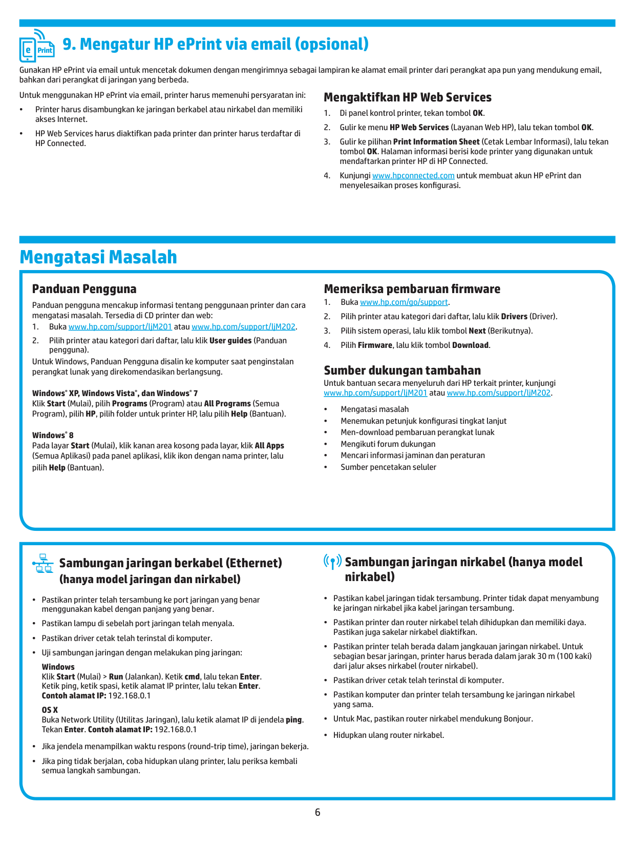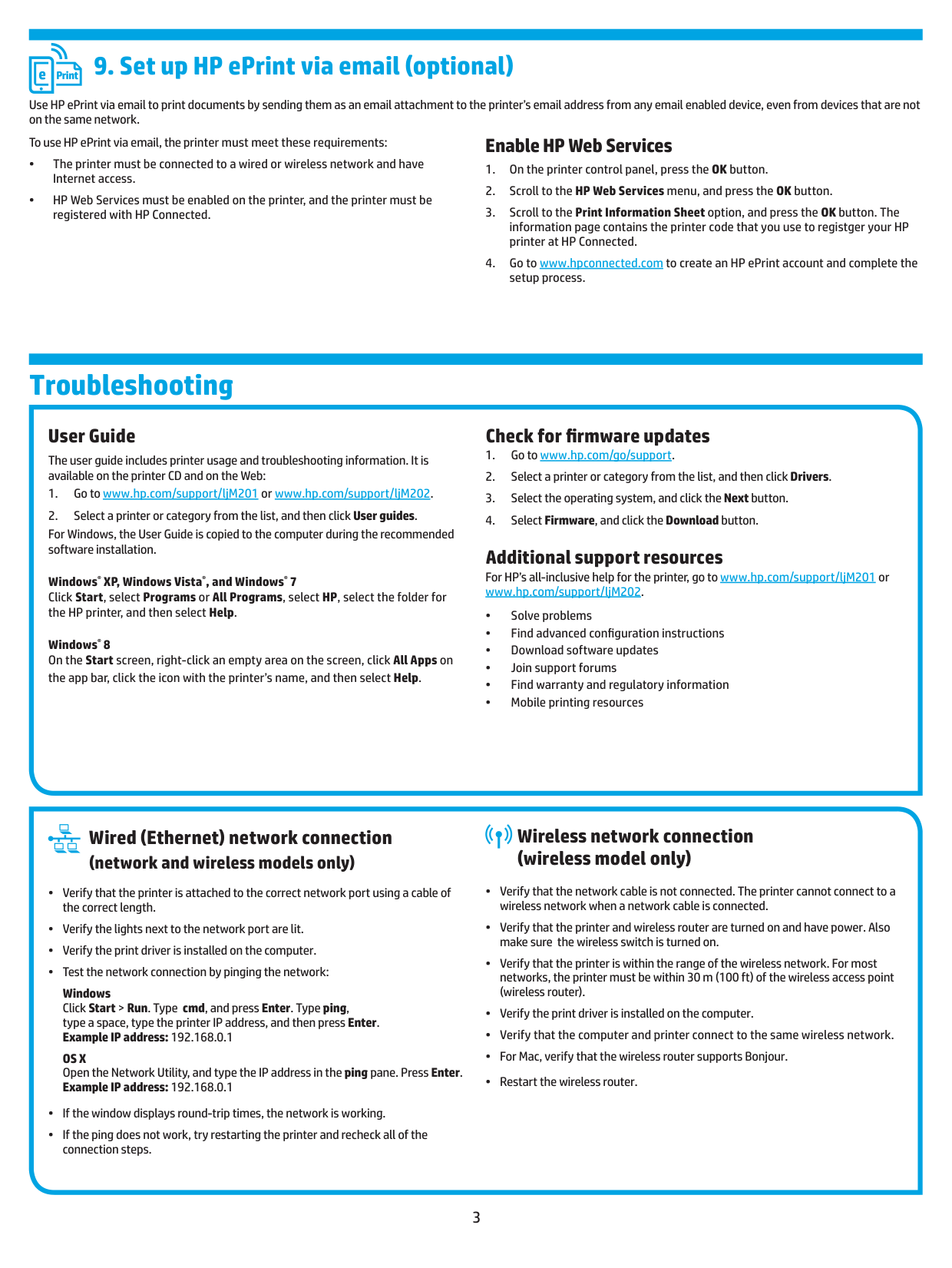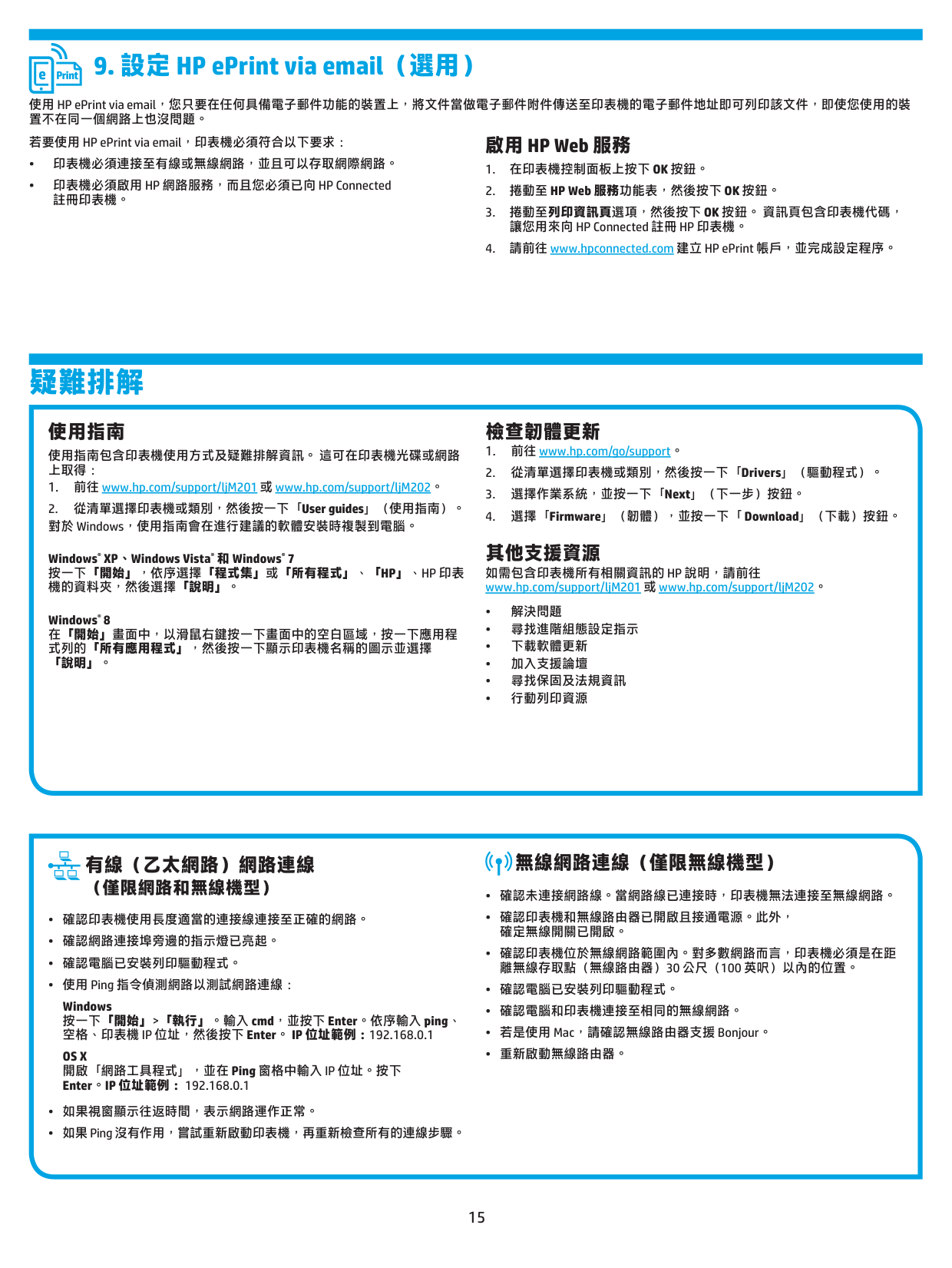 www.hp.com/support/ljM201 或 www.hp.com/support/ljM202。 • 解決問題 • 尋找進階組態設定指示 • 下載軟體更新 • 加入支援論壇 • 尋找保固及法規資訊 • 行動列印資源 有線(乙太網路)網路連線 (僅限網路和無線機型)Os X