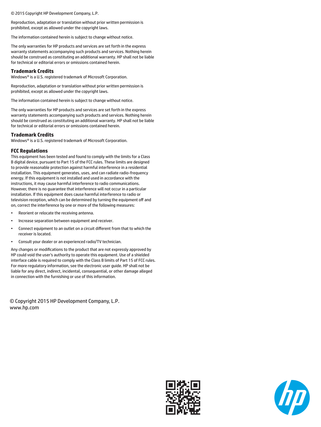 © 2015 Copyright HP Development Company, L.P. Reproduction, adaptation or translation without prior written permission is prohibited, except as allowed under the copyright laws. The information contained herein is subject to change without notice. The only warranties for HP products and services are set forth in the express warranty statements accompanying such products and services. Nothing herein should be construed as constituting an additional warranty. HP shall not be liable for technical or editorial errors or omissions contained herein. Trademark Credits Windows® is a U.S. registered trademark of Microsoft Corporation. Reproduction, adaptation or translation without prior written permission is prohibited, except as allowed under the copyright laws. The information contained herein is subject to change without notice. The only warranties for HP products and services are set forth in the express warranty statements accompanying such products and services. Nothing herein should be construed as constituting an additional warranty. HP shall not be liable for technical or editorial errors or omissions contained herein. Trademark Credits Windows® is a U.S. registered trademark of Microsoft Corporation. FCC Regulations This equipment has been tested and found to comply with the limits for a Class B digital device, pursuant to Part 15 of the FCC rules. These limits are designed to provide reasonable protection against harmful interference in a residential installation. This equipment generates, uses, and can radiate radio-frequency energy. If this equipment is not installed and used in accordance with the instructions, it may cause harmful interference to radio communications. However, there is no guarantee that interference will not occur in a particular installation. If this equipment does cause harmful interference to radio or television reception, which can be determined by turning the equipment off and on, correct the interference by one or more of the following measures: • Reorient or relocate the receiving antenna. • Increase separation between equipment and receiver. • Connect equipment to an outlet on a circuit different from that to which the receiver is located. • Consult your dealer or an experienced radio/TV technician. Any changes or modifications to the product that are not expressly approved by HP could void the user’s authority to operate this equipment. Use of a shielded interface cable is required to comply with the Class B limits of Part 15 of FCC rules. For more regulatory information, see the electronic user guide. HP shall not be liable for any direct, indirect, incidental, consequential, or other damage alleged in connection with the furnishing or use of this information. © Copyright 2015 HP Development Company, L.P. www.hp.com