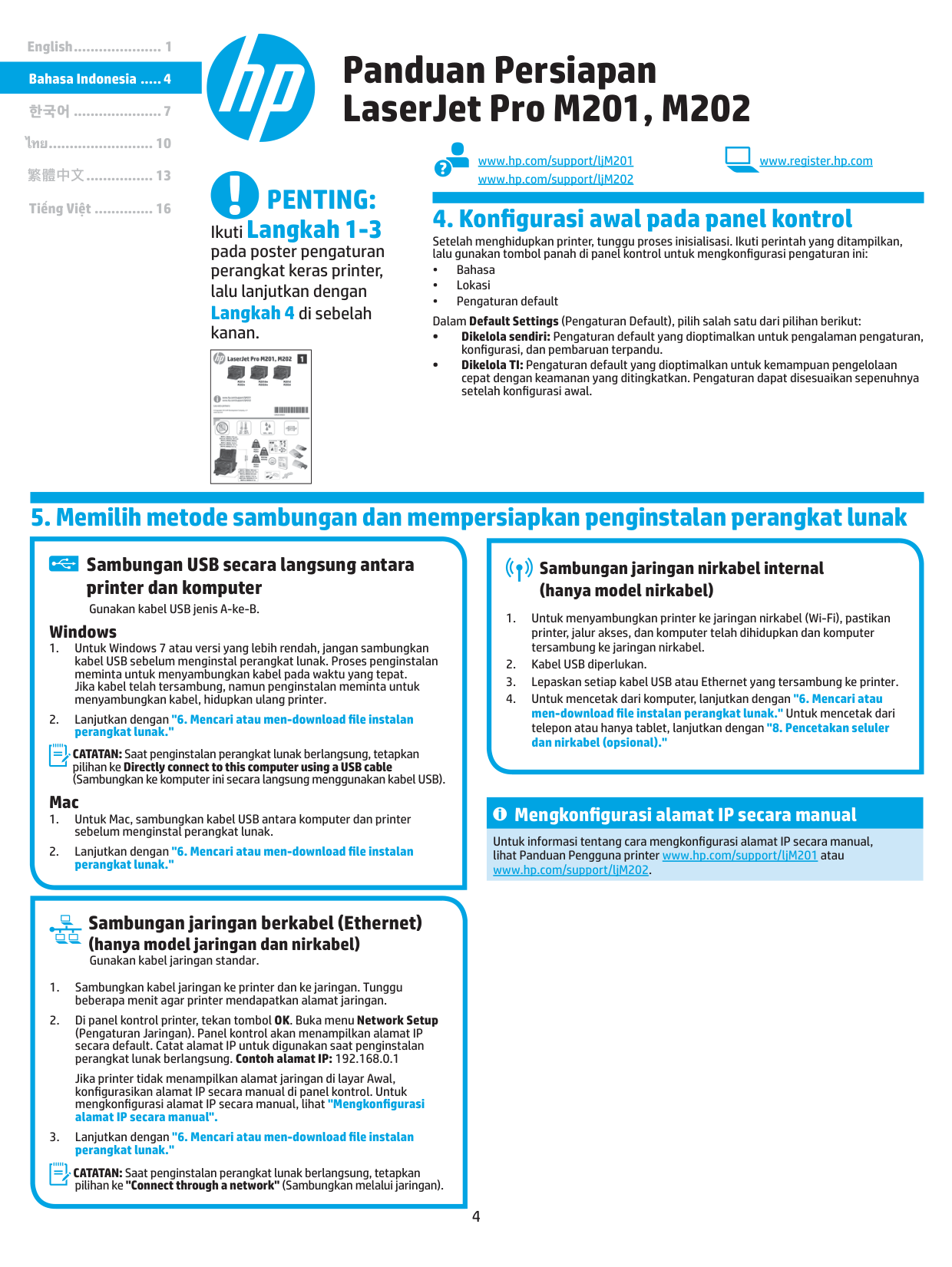 Ikuti Langkah 1-3 pada poster pengaturan perangkat keras printer, lalu lanjutkan dengan Langkah 4 di sebelah kanan. www.hp.com/support/ljM201 www.register.hp.com Panduan Persiapan LaserJet Pro M201, M202 www.hp.com/support/ljM2025 Solusi lengkap OS X