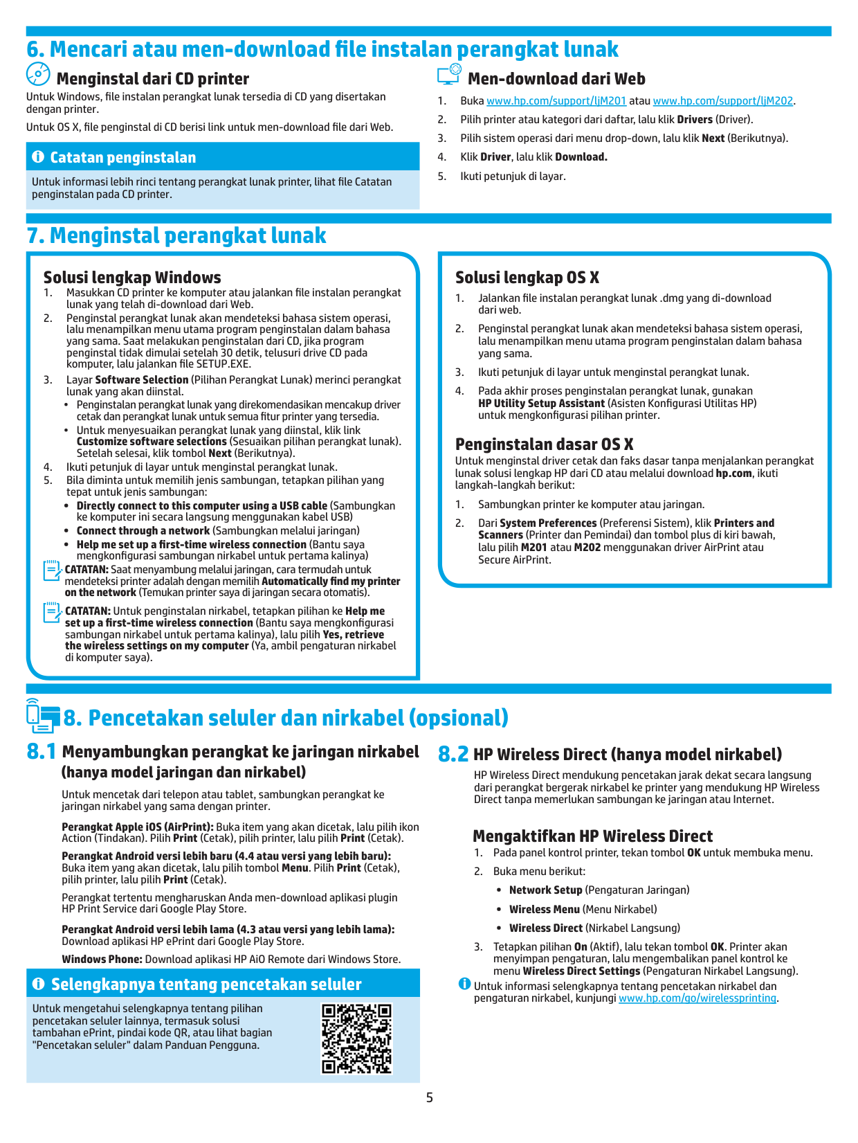 (hanya model jaringan dan nirkabel) Untuk mencetak dari telepon atau tablet, sambungkan perangkat ke jaringan nirkabel yang sama dengan printer. Perangkat Apple iOS (AirPrint): Buka item yang akan dicetak, lalu pilih ikon Action (Tindakan). Pilih Print (Cetak), pilih printer, lalu pilih Print (Cetak). Perangkat Android versi lebih baru (4.4 atau versi yang lebih baru): Buka item yang akan dicetak, lalu pilih tombol Menu. Pilih Print (Cetak), pilih printer, lalu pilih Print (Cetak). Perangkat tertentu mengharuskan Anda men-download aplikasi plugin HP Print Service dari Google Play Store. Perangkat Android versi lebih lama (4.3 atau versi yang lebih lama): Download aplikasi HP ePrint dari Google Play Store. Windows Phone: Download aplikasi HP AiO Remote dari Windows Store. Selengkapnya tentang pencetakan seluler Untuk mengetahui selengkapnya tentang pilihan pencetakan seluler lainnya, termasuk solusi tambahan ePrint, pindai kode QR, atau lihat bagian "Pencetakan seluler" dalam Panduan Pengguna.