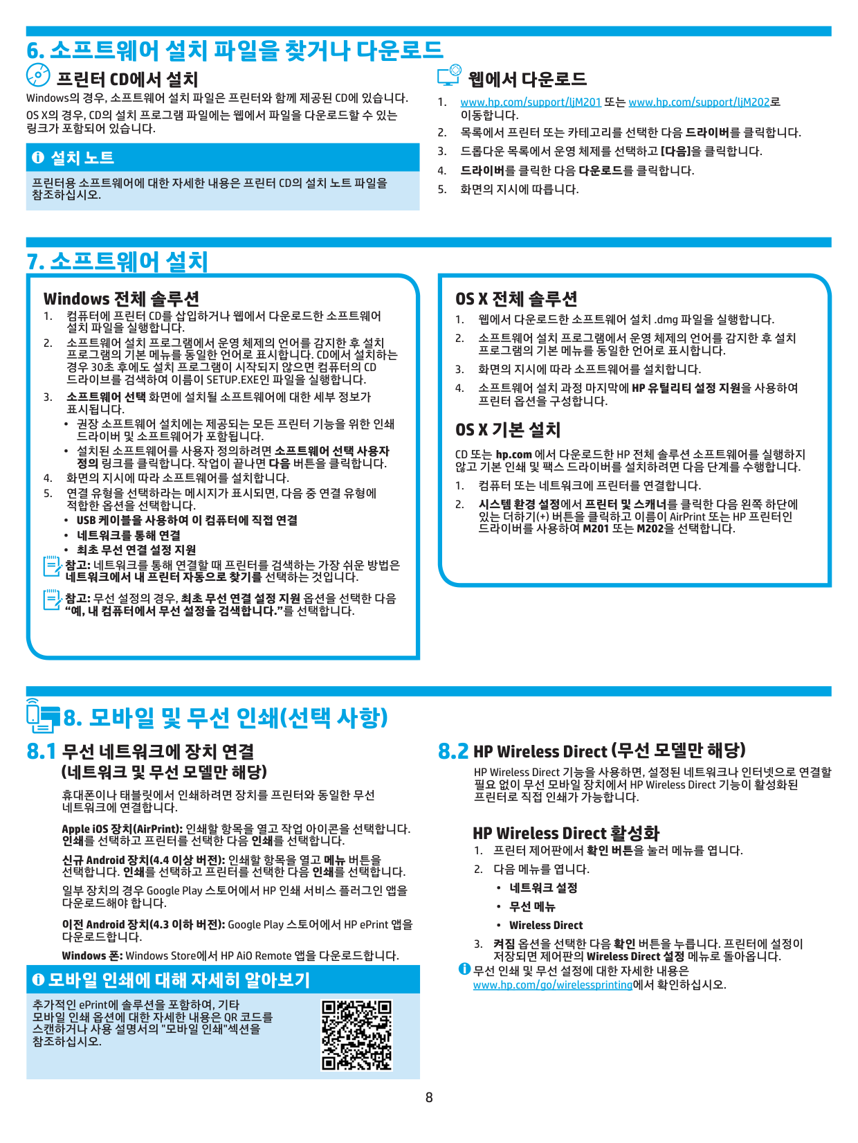 (network and wireless models only) To print from a phone or tablet, connect the device to the same wireless network as the printer. Apple iOS devices (AirPrint): Open the item to print, and select the Action icon. Select Print, select the printer, and then select Print. Newer Android devices (4.4 or newer): Open the item to print, and select the Menu button. Select Print, select the printer, and select Print. Some devices require downloading the HP Print Service plugin app from the Google Play store. Older Android Devices (4.3 or older): Download the HP ePrint app from the Google Play store. Windows Phone: Download the HP AiO Remote app from the Windows Store. Learn more about mobile printing To learn more about other mobile printing options, including additional ePrint solutions, scan the QR code, or see the “Mobile printing” section of the User Guide.