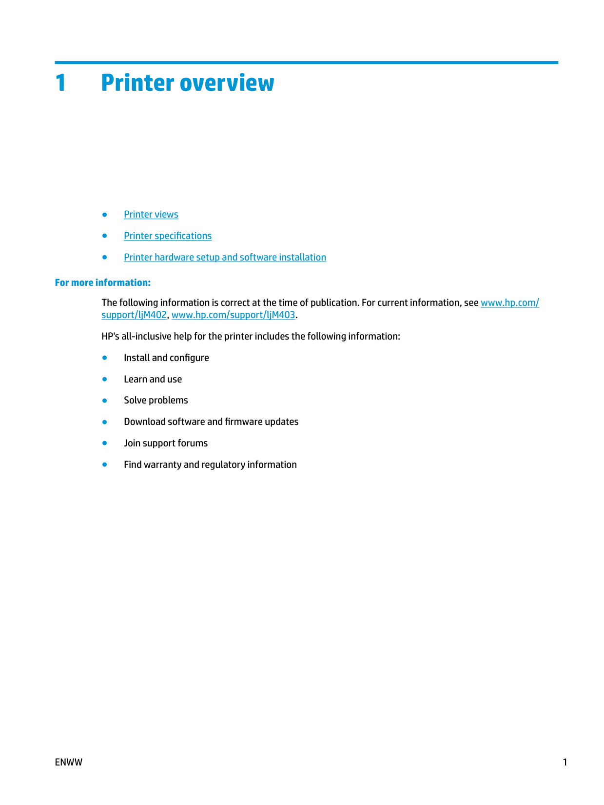 vii1 Printer overview ● Printer views ● Printer specifications ● Printer hardware setup and software installation For more information: The following information is correct at the time of publication. For current information, see www.hp.com/ support/ljM402, www.hp.com/support/ljM403. HP's all-inclusive help for the printer includes the following information: ● Install and configure ● Learn and use ● Solve problems ● Download software and firmware updates ● Join support forums ● Find warranty and regulatory information