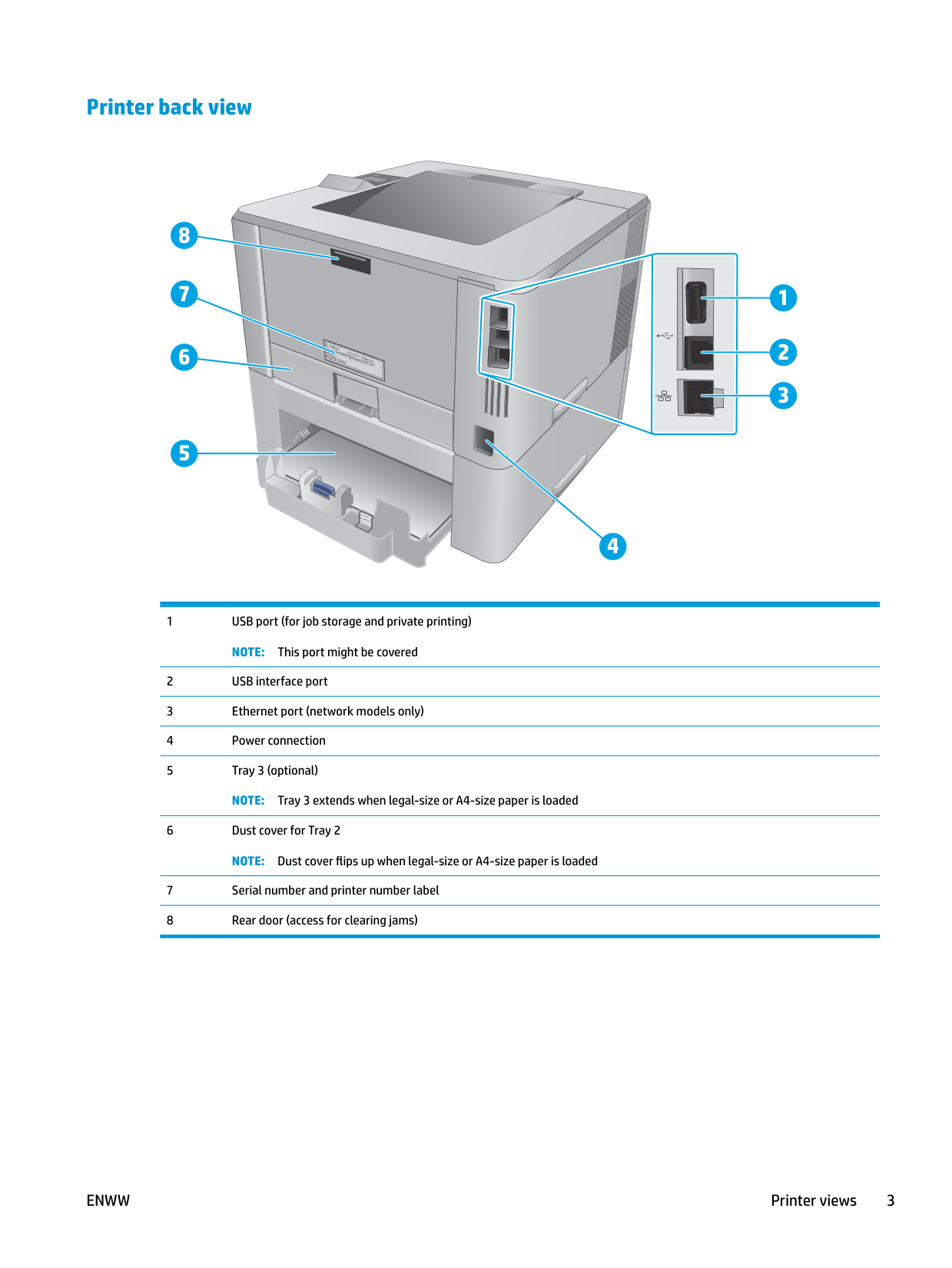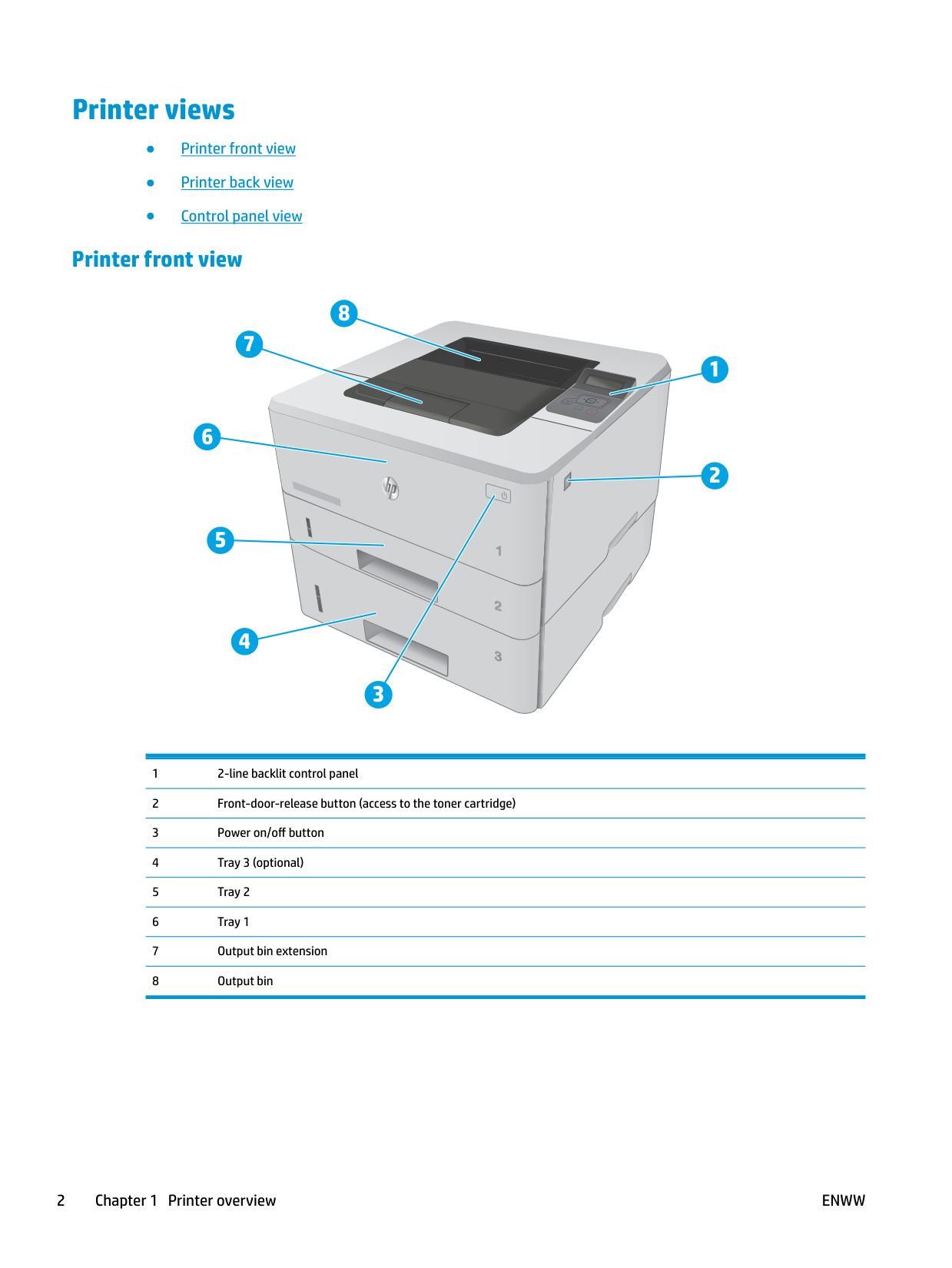 3 2 1 1 4 5 6 8 7 2 3 1 2-line backlit control panel 2 Front-door-release button (access to the toner cartridge) 3 Power on/off button 4 Tray 3 (optional) 5 Tray 2 6 Tray 1 7 Output bin extension 8 Output bin 2 Chapter 1 Printer overviewEnww